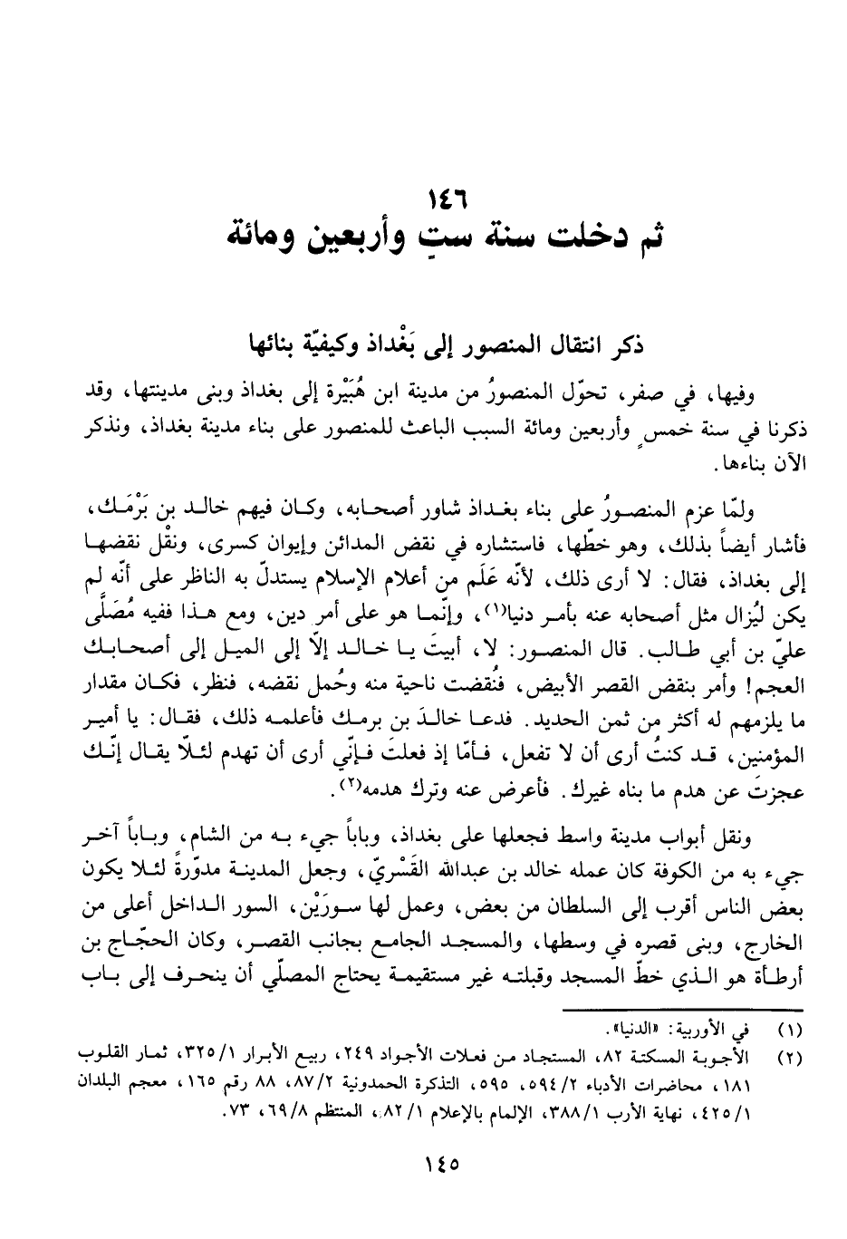 وَفِيهَا فِي صَفَرٍ، تَحَوَّلَ الْمَنْصُورُ مِنْ مَدِينَةِ ابْنِ هُبَيْرَةَ إِلَى بَغْدَاذَ وَبَنَى مَدِينَتَهَا، وَقَدْ ذَكَرْنَا فِي سَنَةِ خَمْسٍ وَأَرْبَعِينَ السَّبَبَ الْبَاعِثَ لِلْمَنْصُورِ عَلَى بِنَاءِ مَدِينَةِ بَغْدَاذَ، وَنَذْكُرُ الْآنَ بِنَاءَهَا.