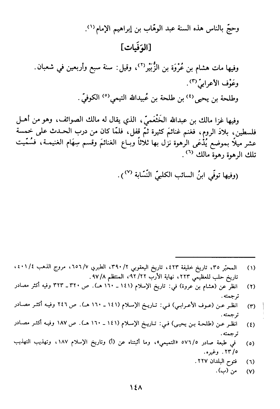 [وَفِيهَا] مَاتَ هِشَامُ بْنُ عُرْوَةَ بْنِ الزُّبَيْرِ، وَقِيلَ سَنَةَ سَبْعٍ وَأَرْبَعِينَ فِي شَعْبَانَ. وَعَوْفٌ الْأَعْرَابِيُّ. وَطَلْحَةُ بْنُ يَحْيَى بْنِ طَلْحَةَ بْنِ عُبَيْدِ اللَّهِ التَّيْمِيُّ الْكُوفِيُّ.