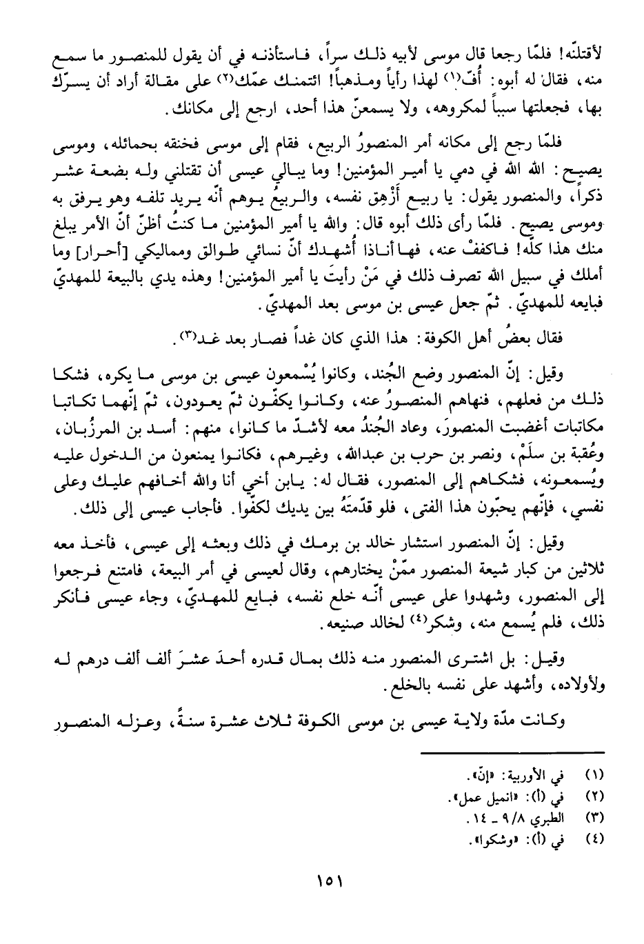 لَأَقْتُلَنَّهُ! فَلَمَّا رَجَعَا قَالَ مُوسَى لِأَبِيهِ ذَلِكَ سِرًّا، فَاسْتَأْذَنَهُ فِي أَنْ يَقُولَ لِلْمَنْصُورِ مَا سَمِعَ مِنْهُ، فَقَالَ لَهُ أَبُوهُ: أُفٍّ لِهَذَا رَأْيًا وَمَذْهَبًا! ائْتَمَنَكَ عَمُّكَ عَلَى مَقَالَةٍ أَرَادَ أَنْ يُسِرَّكَ بِهَا فَجَعَلْتَهَا سَبَبًا لِمَكْرُوهِهِ، وَلَا يَسْمَعَنَّ هَذَا أَحَدٌ، ارْجِعْ إِلَى مَكَانِكَ.