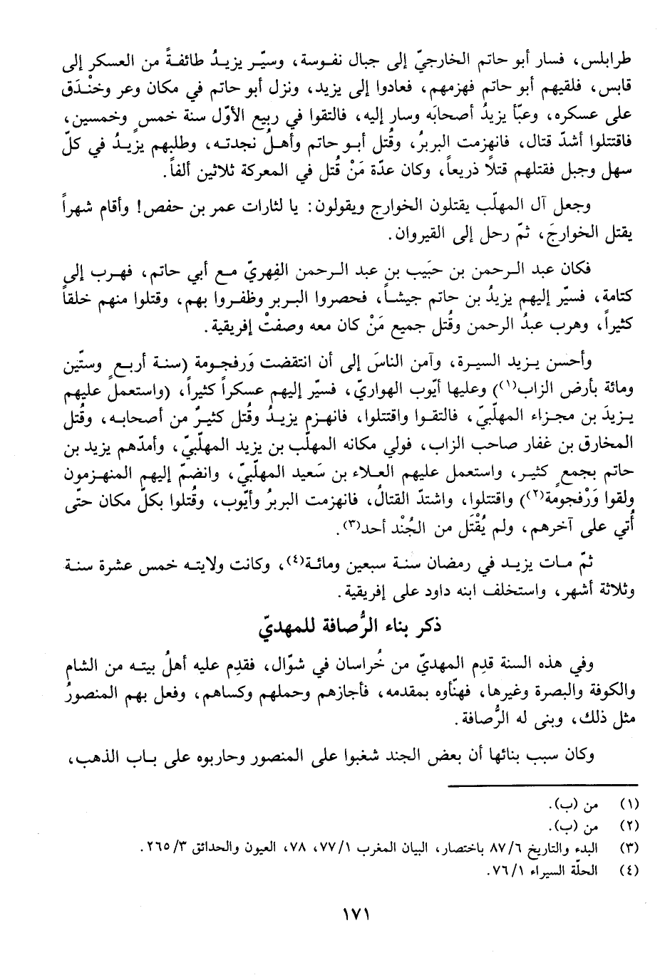 فَوَلِيَ مَكَانَهُ الْمُهَلَّبُ بْنُ يَزِيدَ الْمُهَلَّبِيُّ، وَأَمَدَّهُمْ يَزِيدُ بْنُ حَاتِمٍ بِجَمْعٍ كَثِيرٍ، وَاسْتَعْمَلَ عَلَيْهِمُ الْعَلَاءَ بْنَ سَعِيدٍ الْمُهَلَّبِيَّ، وَانْضَمَّ إِلَيْهِمُ الْمُنْهَزِمُونَ وَلَقُوا وَرْفَجُومَةَ) وَاقْتَتَلُوا، وَاشْتَدَّ الْقِتَالُ، فَانْهَزَمَتِ الْبَرْبَرُ وَأَيُّوبُ، وَقُتِلُوا بِكُلِّ مَكَانٍ حَتَّى أُتِيَ عَلَى آخِرِهِمْ، وَلَمْ يُقْتَلْ مِنَ الْجُنْدِ أَحَدٌ.