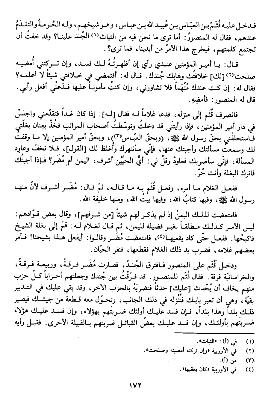 فَدَخَلَ عَلَيْهِ قُثَمُ بْنُ الْعَبَّاسِ بْنِ عُبَيْدِ اللَّهِ بْنِ عَبَّاسٍ، وَهُوَ شَيْخُهُمْ، وَلَهُ الْحُرْمَةُ وَالتَّقَدُّمُ عِنْدَهُمْ، فَقَالَ لَهُ الْمَنْصُورُ: أَمَا تَرَى مَا نَحْنُ فِيهِ مِنِ الْتِيَاثِ الْجُنْدِ عَلَيْنَا؟ وَقَدْ خِفْتُ أَنْ تُجْمَعَ كَلِمَتُهُمْ فَيَخْرُجَ هَذَا الْأَمْرُ مِنْ أَيْدِينَا، فَمَا تَرَى؟