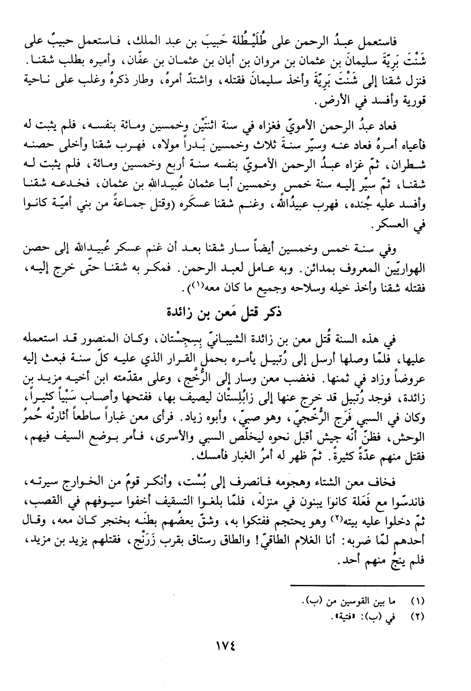 فِي هَذِهِ السَّنَةِ قُتِلَ مَعْنُ بْنُ زَائِدَةَ الشَّيْبَانِيُّ بِسِجِسْتَانَ، وَكَانَ الْمَنْصُورُ قَدِ اسْتَعْمَلَهُ عَلَيْهَا، فَلَمَّا وَصَلَهَا أَرْسَلَ إِلَى رُتْبِيلَ يَأْمُرُهُ بِحَمْلِ الْقَرَارِ الَّذِي عَلَيْهِ كُلَّ سَنَةٍ، فَبَعَثَ إِلَيْهِ عُرُوضًا، وَزَادَ فِي ثَمَنِهَا، فَغَضِبَ مَعْنٌ وَسَارَ إِلَى الرُّخَّجِ وَعَلَى مُقَدِّمَتِهِ ابْنُ أَخِيهِ مَزِيدُ بْنُ زَائِدَةَ، فَوَجَدَ رُتْبِيلَ قَدْ خَرَجَ عَنْهَا إِلَى زَابُلِسْتَانَ لِيُصَيِّفَ بِهَا، فَفَتَحَهَا وَأَصَابَ سَبْيًا كَثِيرًا، وَكَانَ فِي السَّبْيِ فَرَجٌ الرُّخَّجِيُّ، وَهُوَ صَبِيُّ، وَأَبُوهُ زِيَادٌ.