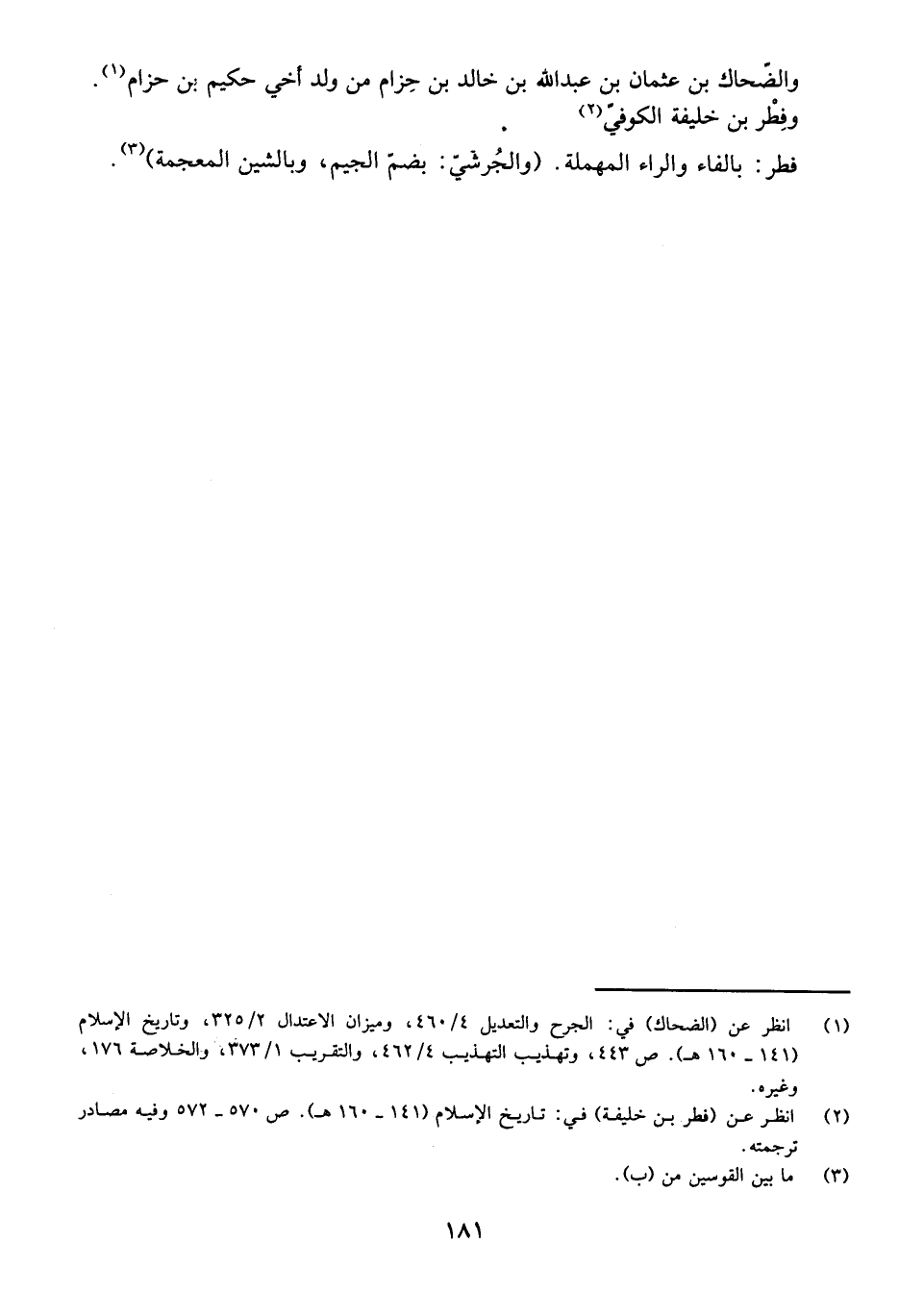 وَالضَّحَّاكُ بْنُ عُثْمَانَ بْنِ عَبْدِ اللَّهِ بْنِ خَالِدِ بْنِ حِزَامٍ مِنْ وَلَدِ أَخِي حَكِيمِ بْنِ حِزَامٍ. وَفِطْرُ بْنُ خَلِيفَةَ الْكُوفِيُّ.