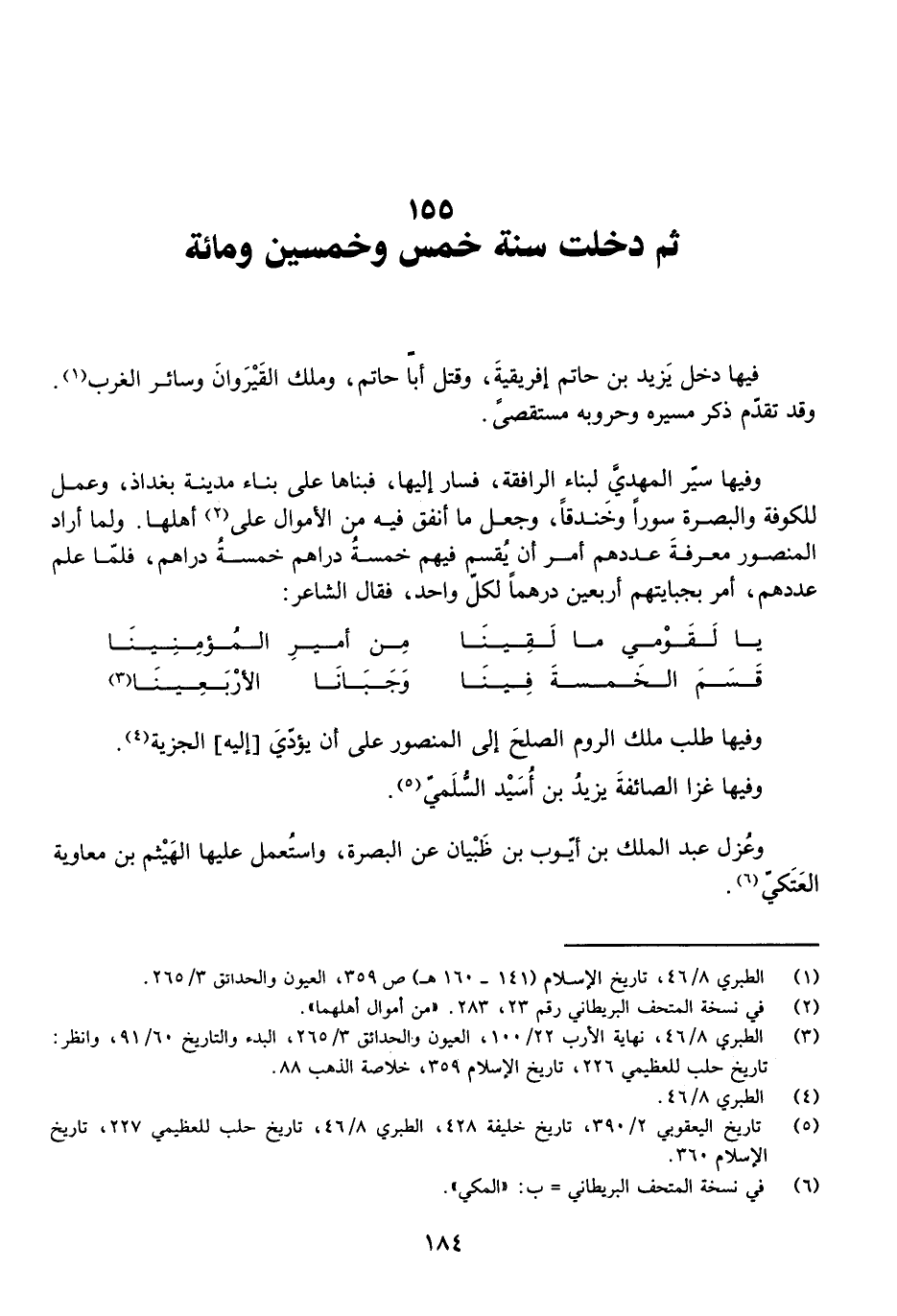 ثُمَّ دَخَلَتْ سَنَةُ خَمْسٍ وَخَمْسِينَ وَمِائَةٍ