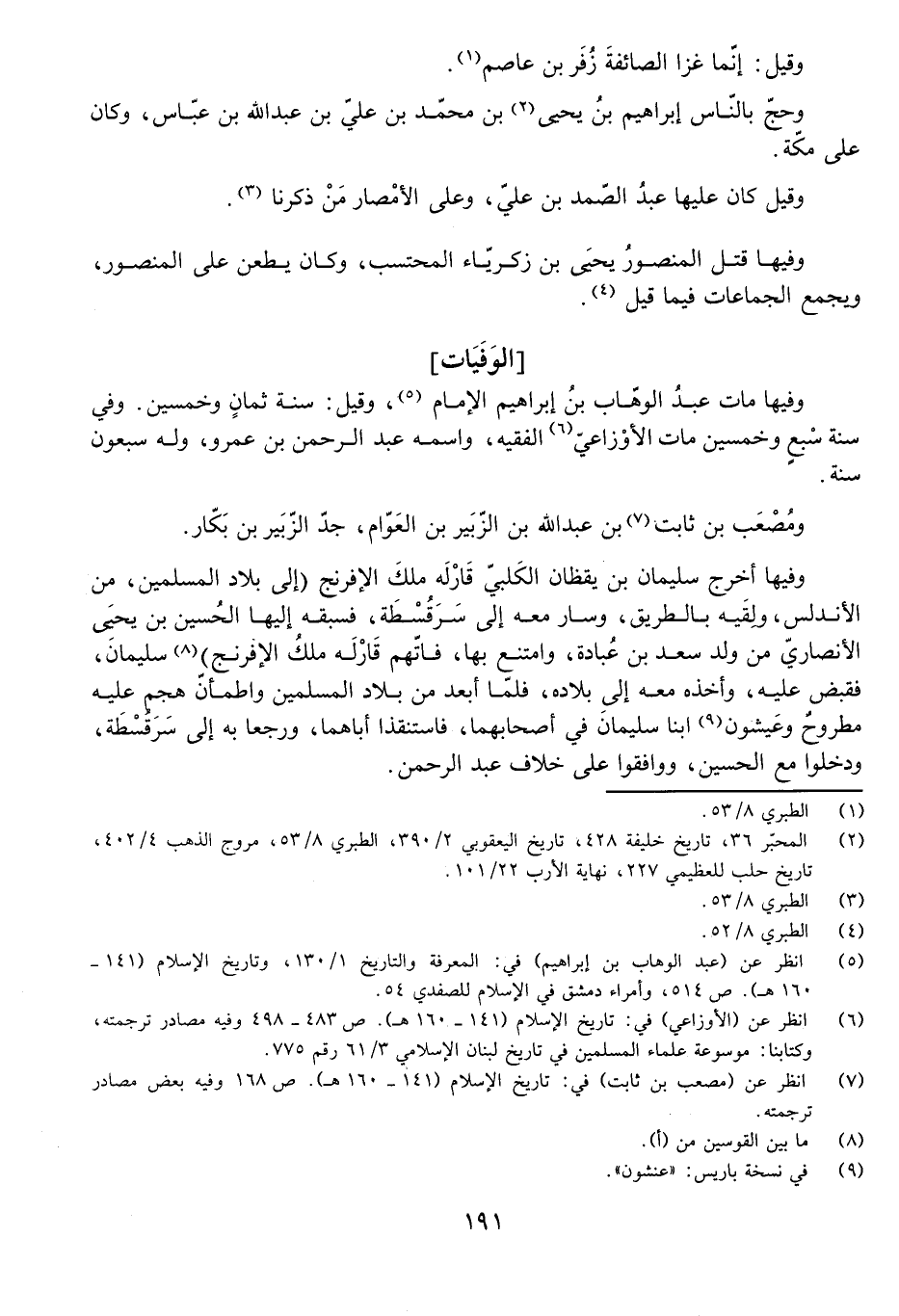 وَفِيهَا مَاتَ عَبْدُ الْوَهَّابِ بْنُ إِبْرَاهِيمَ الْإِمَامِ، وَقِيلَ: سَنَةَ ثَمَانٍ وَخَمْسِينَ: وَفِي سَنَةِ سَبْعٍ وَخَمْسِينَ مَاتَ الْأَوْزَاعِيُّ الْفَقِيهُ، وَاسْمُهُ عَبْدُ الرَّحْمَنِ بْنُ عَمْرٍو، وَلَهُ سَبْعُونَ سَنَةً، وَمُصْعَبُ بْنُ ثَابِتِ بْنِ عَبْدِ اللَّهِ بْنِ الزُّبَيْرِ بْنِ الْعَوَّامِ جَدُّ الزُّبَيْرِ بْنِ بَكَّارٍ.
