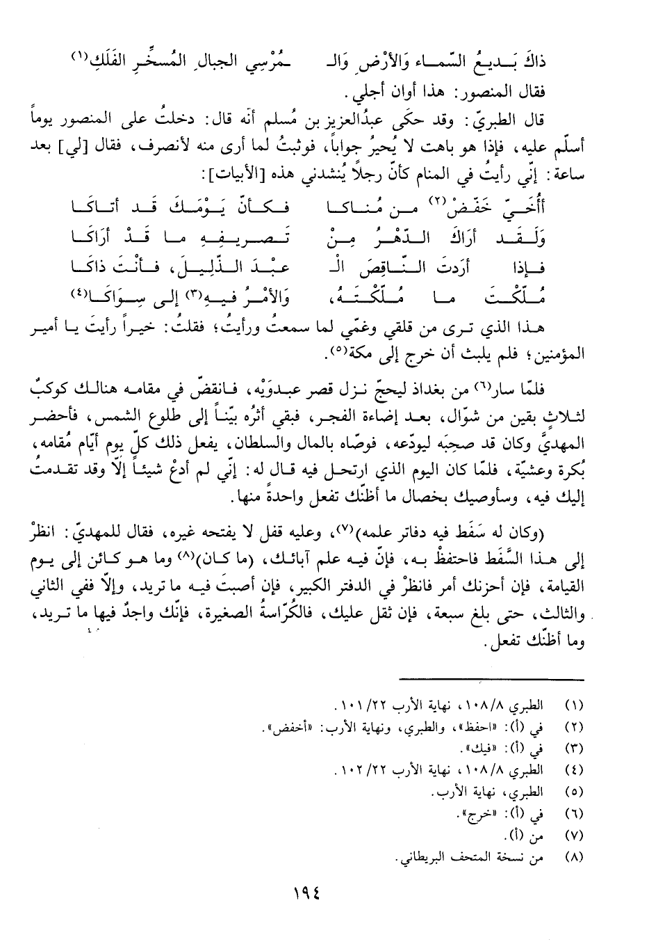 قَالَ الطَّبَرِيُّ: وَقَدْ حَكَى عَبْدُ الْعَزِيزِ بْنُ مُسْلِمٍ أَنَّهُ قَالَ: دَخَلْتُ عَلَى الْمَنْصُورِ يَوْمًا أُسَلِّمُ عَلَيْهِ، فَإِذَا هُوَ بَاهِتٌ لَا يُحِيرُ جَوَابًا، فَوَثَبْتُ لِمَا أَرَى مِنْهُ لِأَنْصَرِفَ، فَقَالَ [لِي] بَعْدَ سَاعَةٍ إِنِّي رَأَيْتُ فِي الْمَنَامِ كَأَنَّ رُجَلًا يُنْشِدُنِي هَذِهِ [الْأَبْيَاتَ] :