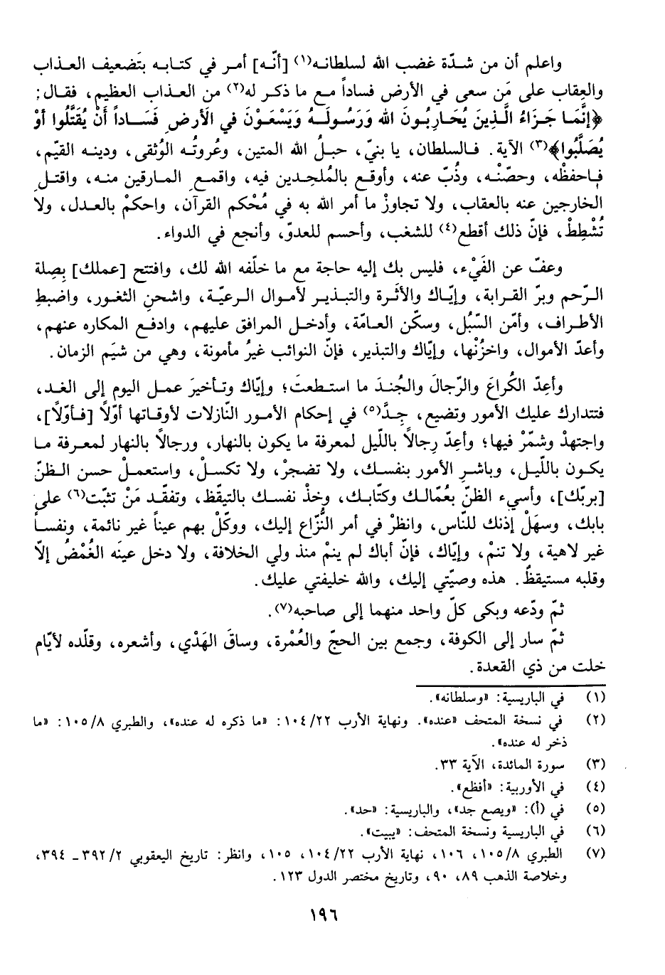 فَالسُّلْطَانُ، يَا بُنَيَّ حَبْلُ اللَّهِ الْمَتِينُ، وَعُرْوَتُهُ الْوُثْقَى، وَدِينُهُ الْقَيِّمُ، فَاحْفَظْهُ، وَحَصِّنْهُ، وَذُبَّ عَنْهُ، وَأَوْقِعْ بِالْمُلْحِدِينَ فِيهِ، وَاقْمَعِ الْمَارِقِينَ مِنْهُ، وَاقْتُلِ الْخَارِجِينَ عَنْهُ بِالْعِقَابِ، وَلَا تُجَاوِزْ مَا أَمَرَ اللَّهُ بِهِ فِي مُحْكَمِ الْقُرْآنِ، وَاحْكُمْ بِالْعَدْلِ، وَلَا تُشْطِطْ، فَإِنَّ ذَلِكَ أَقْطَعُ لِلشَّغَبِ، وَأَحْسَمُ لِلْعَدُوِّ، وَأَنْجَعُ فِي الدَّوَاءِ.
