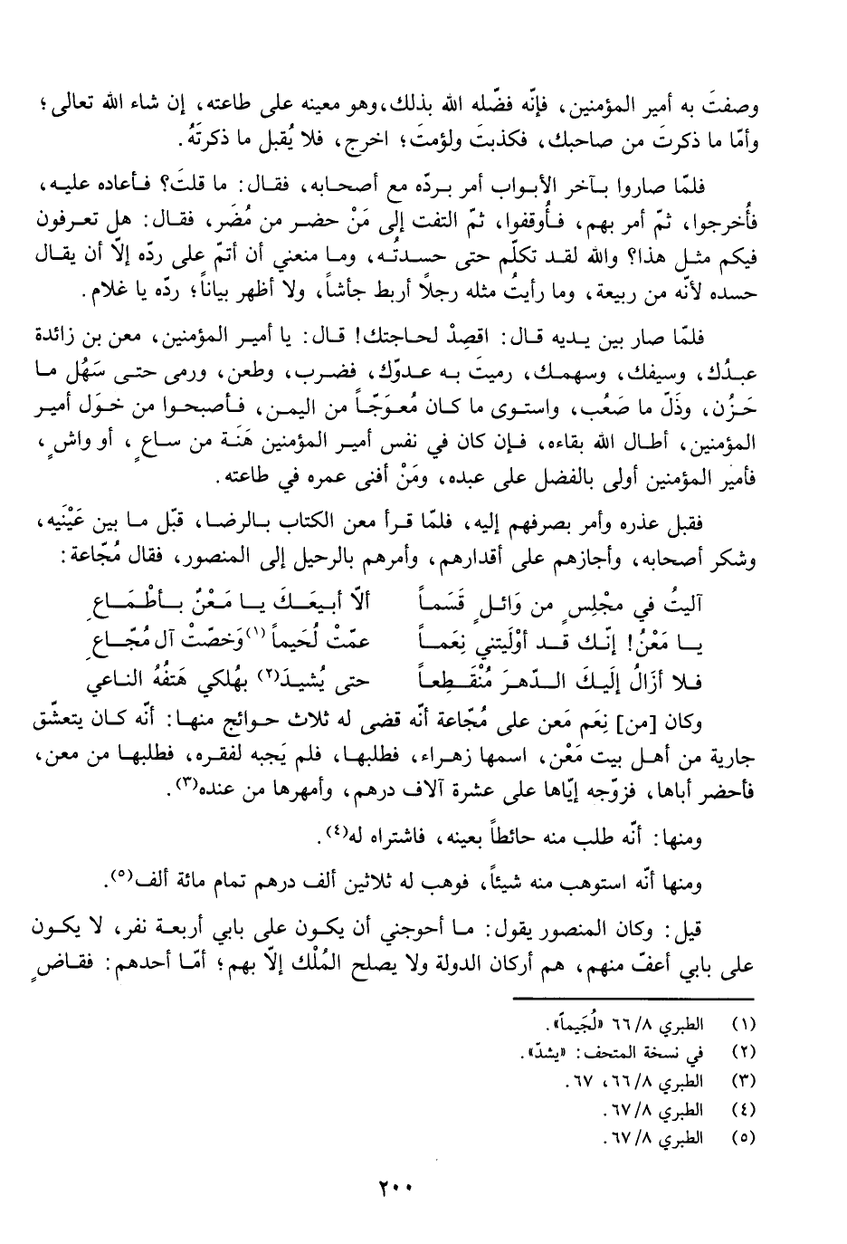 فَلَمَّا صَارُوا بِآخِرِ الْأَبْوَابِ أَمَرَ بِرَدِّهِ مَعَ أَصْحَابِهِ، فَقَالَ: مَا قُلْتَ؟ فَأَعَادَهُ عَلَيْهِ، فَأُخْرِجُوا، ثُمَّ أَمَرَ بِهِمْ، فَأُوقِفُوا، ثُمَّ الْتَفَتَ إِلَى مَنْ حَضَرَ مِنْ مُضَرَ، فَقَالَ: هَلْ تَعْرِفُونَ فِيكُمْ مِثْلَ هَذَا؟ وَاللَّهِ لَقَدْ تَكَلَّمَ حَتَّى حَسَدْتُهُ، وَمَا مَنَعَنِي أَنْ أُتِمَّ عَلَى رَدِّهِ إِلَّا أَنْ يُقَالَ حَسَدَهُ لِأَنَّهُ مِنْ رَبِيعَةَ، وَمَا رَأَيْتُ مِثْلَهُ رُجَلًا أَرْبَطَ جَأْشًا، وَلَا أَظْهَرَ بَيَانًا، رُدَّهُ يَا غُلَامُ.
