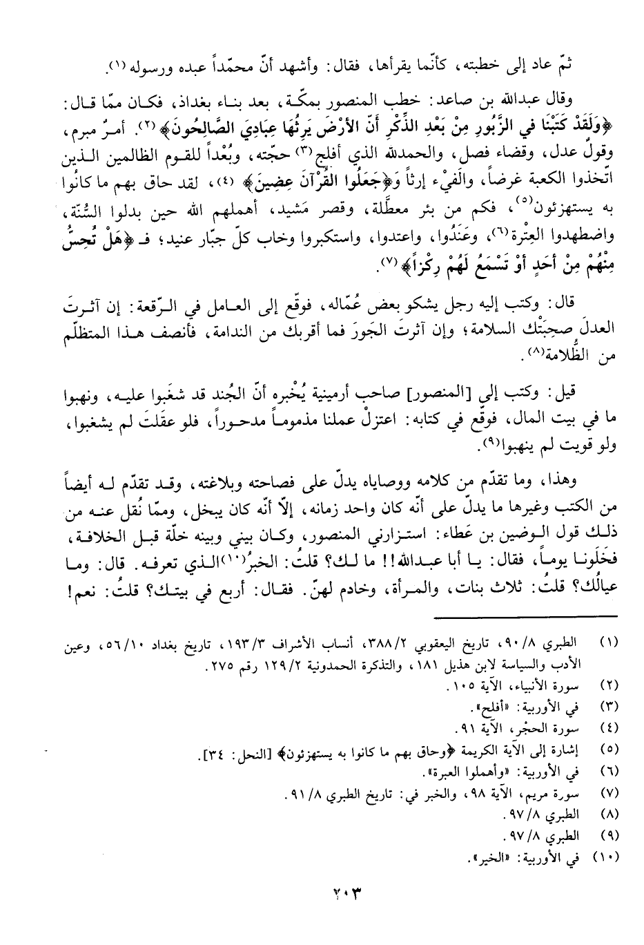 وَقَالَ عَبْدُ اللَّهِ بْنُ صَاعِدٍ: خَطَبَ الْمَنْصُورُ بِمَكَّةَ، بَعْدَ بِنَاءِ بَغْدَاذَ، فَكَانَ مِمَّا قَالَ: {وَلَقَدْ كَتَبْنَا فِي الزَّبُورِ مِنْ بَعْدِ الذِّكْرِ أَنَّ الْأَرْضَ يَرِثُهَا عِبَادِيَ الصَّالِحُونَ} [الأنبياء: 105] . أَمْرٌ مُبْرَمٌ، وَقَوْلٌ عَدْلٌ، وَقَضَاءٌ فَصْلٌ، وَالْحَمْدُ لِلَّهِ الَّذِي أَفْلَجَ حُجَّتَهُ، وَبُعْدًا لِلْقَوْمِ الظَّالِمِينَ الَّذِينَ اتَّخَذُوا الْكَعْبَةَ غَضًّا، وَالْفَيْءَ إِرْثًا وَ {جَعَلُوا الْقُرْآنَ عِضِينَ} [الحجر: 91] ، لَقَدْ حَاقَ بِهِمْ مَا كَانُوا بِهِ يَسْتَهْزِئُونَ، فَكَمْ مِنْ بِئْرٍ مُعَطَّلَةٍ، وَقَصْرٍ مَشِيدٍ أَهْمَلَهُمُ اللَّهُ حِينَ بَدَّلُوا السُّنَّةَ، وَاضْطَهَدُوا الْعِتْرَةَ، وَعَنَدُوا، وَاعْتَدَوْا، وَاسْتَكْبَرُوا وَخَابَ كُلُّ جَبَّارٍ عَنِيدٍ، {هَلْ تُحِسُّ مِنْهُمْ مِنْ أَحَدٍ أَوْ تَسْمَعُ لَهُمْ رِكْزًا} [مريم: 98] .