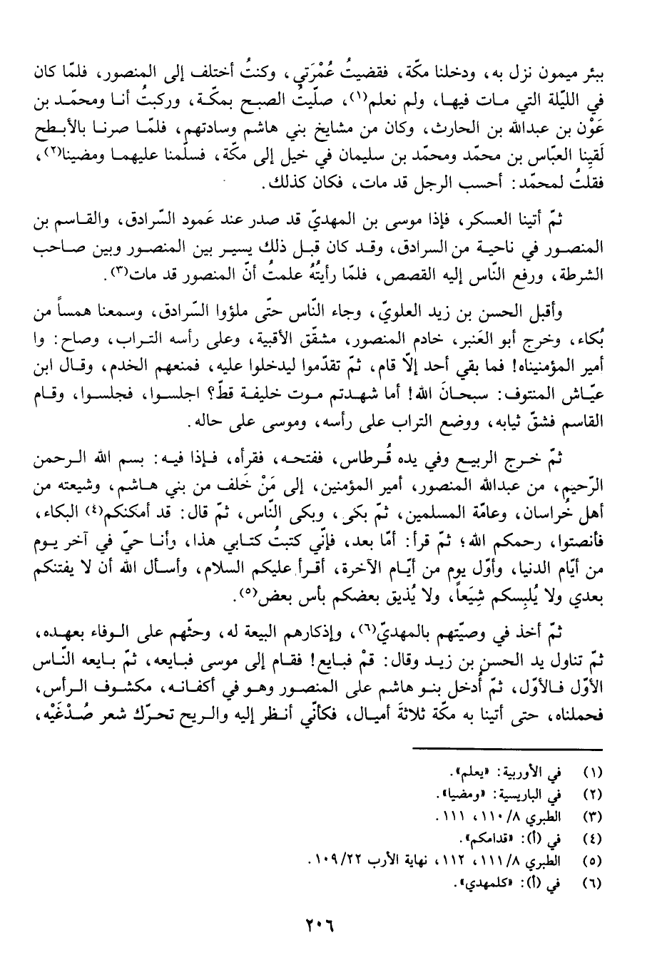 ثُمَّ أَخَذَ فِي وَصِيَّتِهِمْ بِالْمَهْدِيِّ، وَإِذْكَارِهِمُ الْبَيْعَةَ لَهُ، وَحَثِّهِمْ عَلَى الْوَفَاءِ بِعَهْدِهِ، ثُمَّ تَنَاوَلَ يَدَ الْحَسَنِ بْنِ زَيْدٍ وَقَالَ: قُمْ فَبَايِعْ! فَقَامَ إِلَى مُوسَى فَبَايَعَهُ، ثُمَّ بَايَعَهُ النَّاسُ الْأَوَّلُ فَالْأَوَّلُ، ثُمَّ أَدْخَلَ بَنُو هَاشِمٍ عَلَى الْمَنْصُورِ وَهُوَ فِي أَكْفَانِهِ، مَكْشُوفَ الرَّأْسِ، فَحَمَلْنَاهُ، حَتَّى أَتَيْنَا بِهِ مَكَّةَ ثَلَاثَ أَمْيَالٍ، فَكَأَنِّي أَنْظُرُ إِلَيْهِ وَالرِّيحُ تُحَرِّكُ شَعْرَ صُدْغَيْهِ،