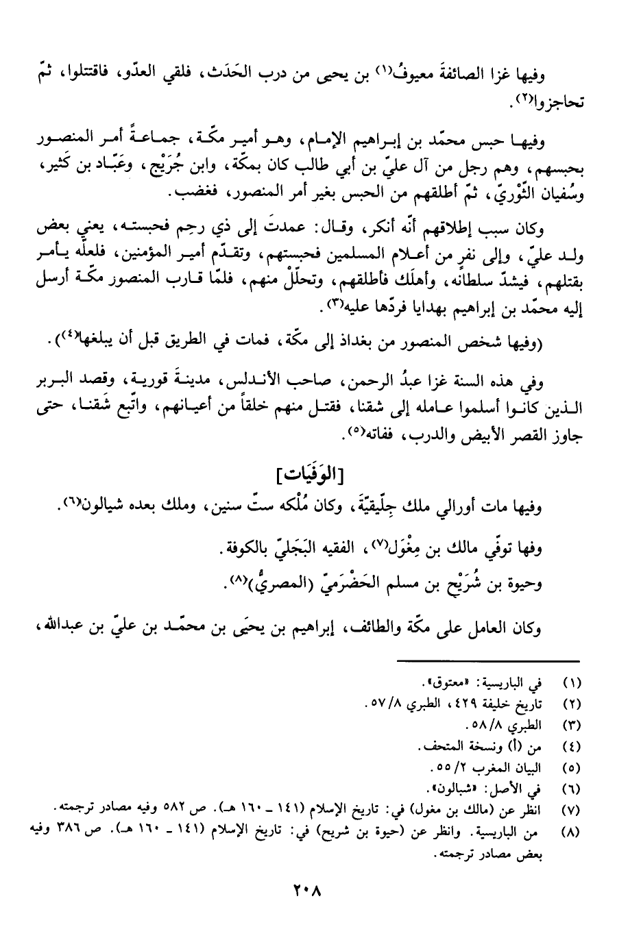 وَفِيهَا حَبَسَ مُحَمَّدُ بْنُ إِبْرَاهِيمَ الْإِمَامِ، وَهُوَ أَمِيرُ مَكَّةَ، جَمَاعَةً أَمَرَ الْمَنْصُورُ بِحَبْسِهِمْ، وَهُمْ رَجُلٌ مِنْ آلِ عَلِيِّ بْنِ أَبِي طَالِبٍ كَانَ بِمَكَّةَ، وَابْنُ جُرَيْجٍ، وَعَبَّادُ بْنُ كَثِيرٍ، وَسُفْيَانُ الثَّوْرِيُّ، ثُمَّ أَطْلَقَهُمْ مِنَ الْحَبْسِ بِغَيْرِ أَمْرِ الْمَنْصُورِ، فَغَضِبَ.