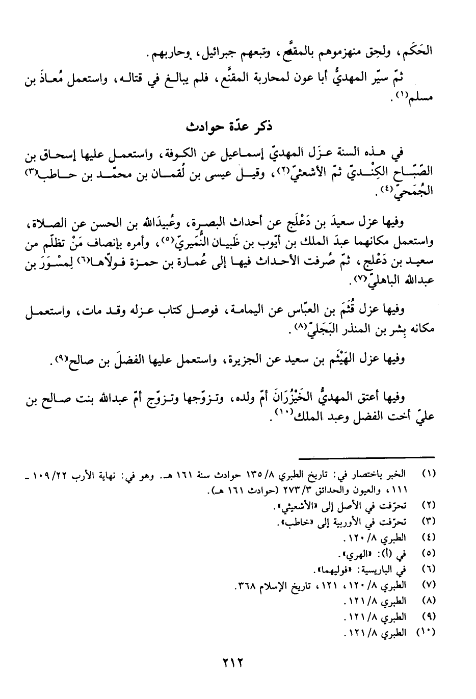 وَفِيهَا عَزَلَ سَعِيدَ بْنَ دَعْلَجٍ عَنْ أَحْدَاثِ الْبَصْرَةِ، وَعُبَيْدَ اللَّهِ بْنَ الْحَسَنِ عَنِ الصَّلَاةِ، وَاسْتَعْمَلَ مَكَانَهُمَا عَبْدَ الْمَلِكِ بْنَ أَيُّوبَ بْنِ ظَبْيَانَ النُّمَيْرِيَّ، وَأَمَرَهُ بِإِنْصَافِ مَنْ تَظَلَّمَ مِنْ سَعِيدِ بْنِ دَعْلَجٍ، ثُمَّ صُرِفَتِ الْأَحْدَاثُ فِيهَا إِلَى عُمَارَةَ بْنِ حَمْزَةَ فَوَلَّاهَا الْمِسْوَرَ بْنَ عَبْدِ اللَّهِ الْبَاهِلِيَّ.