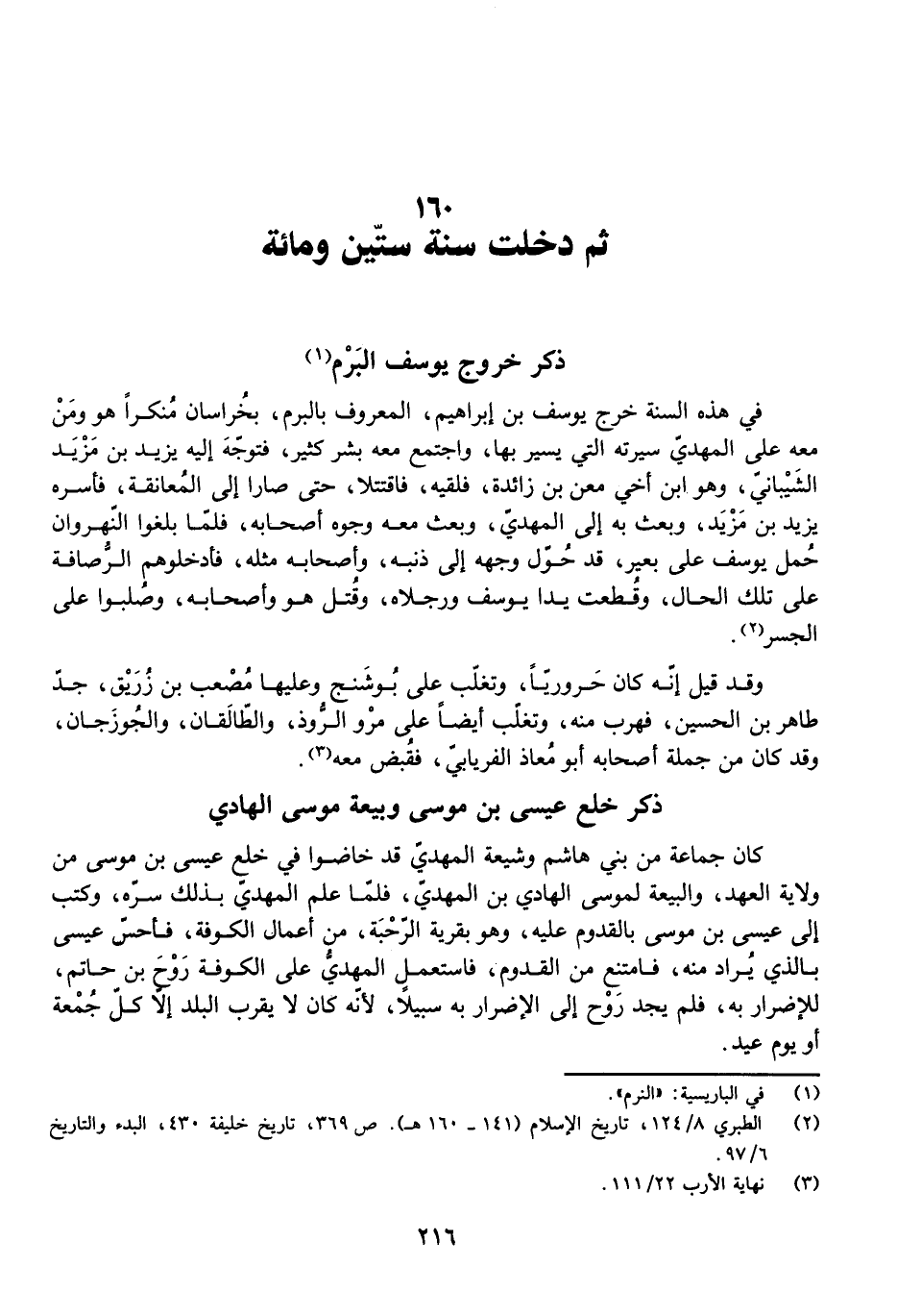 فِي هَذِهِ السَّنَةِ خَرَجَ يُوسُفُ بْنُ إِبْرَاهِيمَ، الْمَعْرُوفُ بِالْبَرْمِ، بِخُرَاسَانَ، مُنْكِرًا هُوَ وَمَنْ مَعَهُ عَلَى الْمَهْدِيِّ سِيرَتَهُ الَّتِي يَسِيرُ بِهَا، وَاجْتَمَعَ مَعَهُ بَشَرٌ كَثِيرٌ، فَتَوَجَّهَ إِلَيْهِ يَزِيدُ بْنُ مَزْيَدٍ الشَّيْبَانِيُّ، وَهُوَ ابْنُ أَخِي مَعْنِ بْنِ زَائِدَةَ، فَلَقِيَهُ فَاقْتَتَلَا، حَتَّى صَارَا إِلَى الْمُعَانَقَةِ، فَأَسَرَهُ يَزِيدُ بْنُ مَزْيَدٍ، وَبَعَثَ بِهِ إِلَى الْمَهْدِيِّ، وَبَعَثَ مَعَهُ وُجُوهَ أَصْحَابِهِ، فَلَمَّا بَلَغُوا النَّهْرَوَانِ حُمِلَ يُوسُفُ عَلَى بَعِيرٍ، قَدْ حُوِّلَ وَجْهُهُ إِلَى ذَنَبِهِ، وَأَصْحَابُهُ مِثْلُهُ، فَأَدْخَلُوهُمُ الرُّصَافَةَ عَلَى تِلْكَ الْحَالِ، وَقُطِعَتْ يَدَا يُوسُفَ وَرِجْلَاهُ، وَقُتِلَ هُوَ وَأَصْحَابُهُ، وَصُلِبُوا عَلَى الْجِسْرِ.