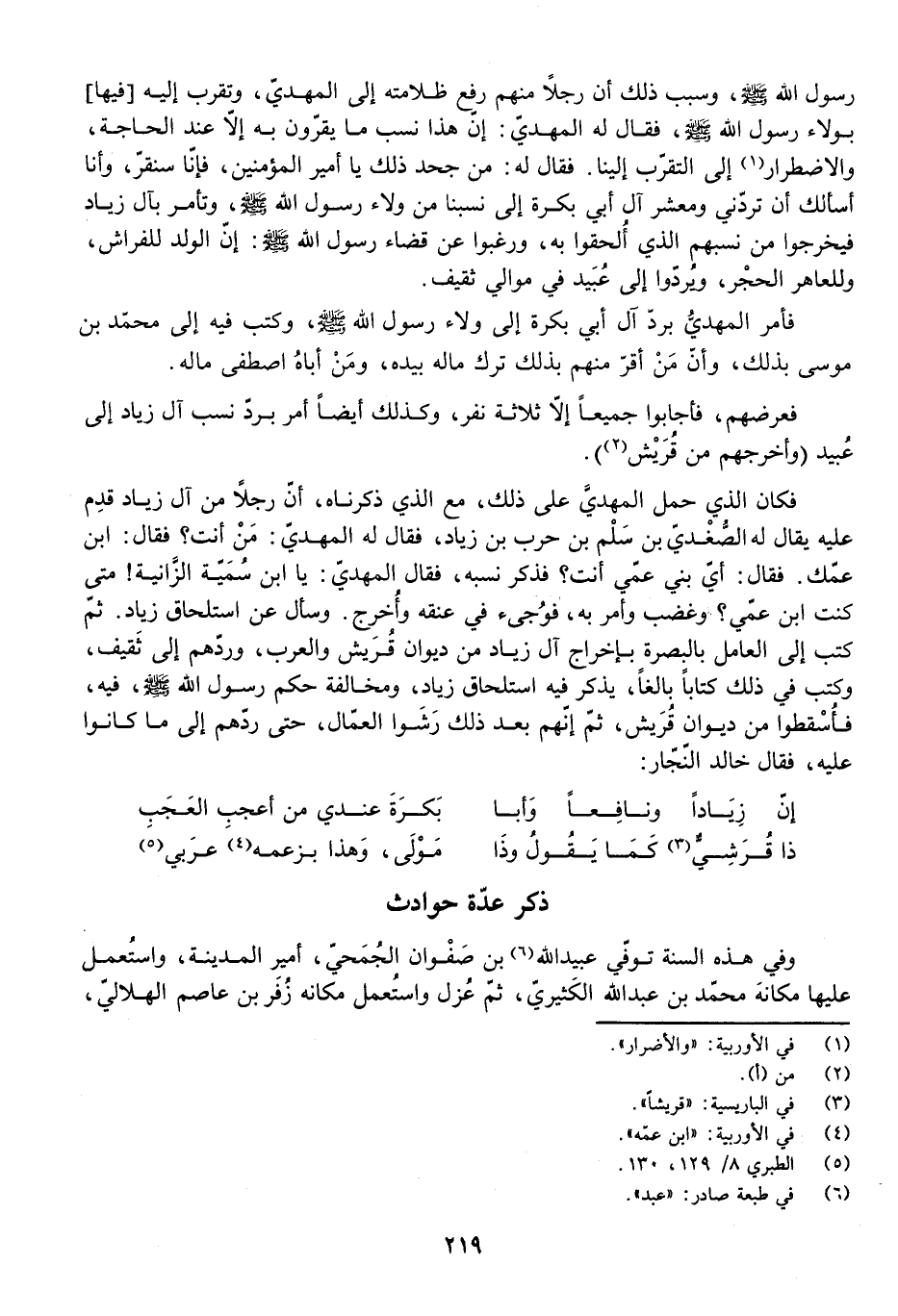 فَعَرَضَهُمْ، فَأَجَابُوا جَمِيعًا إِلَّا ثَلَاثَةَ نَفَرٍ، وَكَذَلِكَ أَيْضًا أَمَرَ بِرَدِّ نَسَبِ آلِ زِيَادٍ إِلَى عُبَيْدٍ. (وَأَخْرَجَهُمْ مِنْ قُرَيْشٍ) .