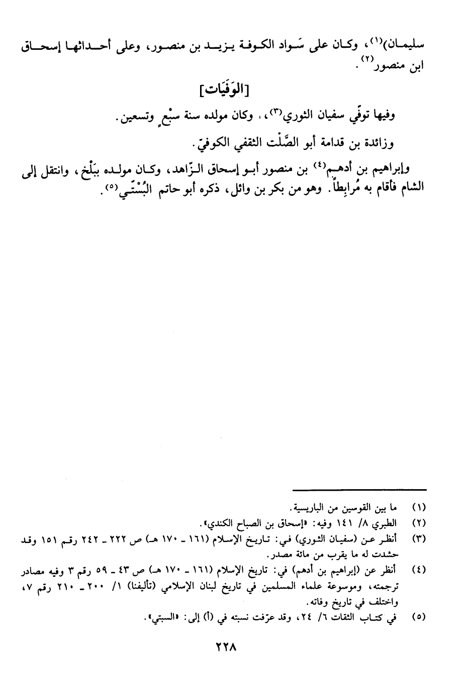وَفِيهَا تُوُفِّيَ سُفْيَانُ الثَّوْرِيُّ، وَكَانَ مَوْلِدُهُ سَنَةَ سَبْعٍ وَتِسْعِينَ، وَزَائِدَةُ بْنُ قُدَامَةَ أَبُو الصَّلْتِ الثَّقَفِيُّ الْكُوفِيُّ، وَإِبْرَاهِيمُ بْنُ أَدْهَمَ بْنِ مَنْصُورٍ أَبُو إِسْحَاقَ الزَّاهِدُ، وَكَانَ مَوْلِدُهُ بِبَلْخٍ، وَانْتَقَلَ إِلَى الشَّامِ فَأَقَامَ بِهِ مُرَابِطًا، وَهُوَ مِنْ بَكْرِ بْنِ وَائِلٍ، ذَكَرَهُ أَبُو حَاتِمٍ الْبُسْتِيُّ.