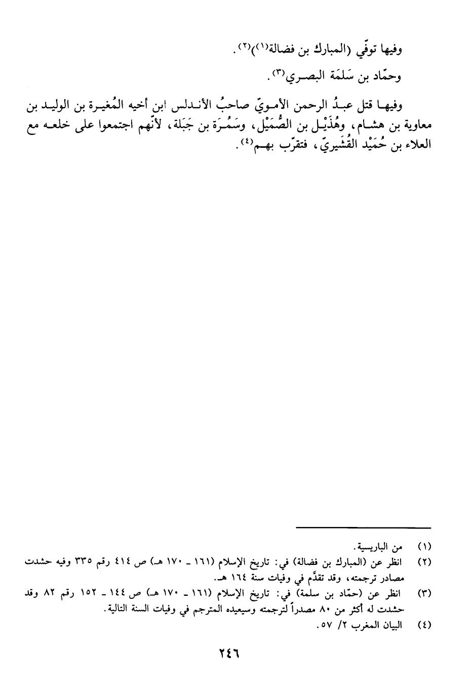 وَفِيهَا قَتَلَ عَبْدُ الرَّحْمَنِ الْأُمَوِيُّ صَاحِبُ الْأَنْدَلُسِ ابْنَ أَخِيهِ الْمُغِيرَةَ بْنَ الْوَلِيدِ بْنِ مُعَاوِيَةَ بْنِ هِشَامٍ، وَهُذَيْلَ بْنَ الصُّمَيْلِ، وَسَمُرَةَ بْنَ جَبَلَةَ، لِأَنَّهُمُ اجْتَمَعُوا عَلَى خَلْعِهِ مَعَ الْعَلَاءِ بْنِ حُمَيْدٍ الْقُشَيْرِيُّ، فَتَقَرَّبَ بِهِمْ.