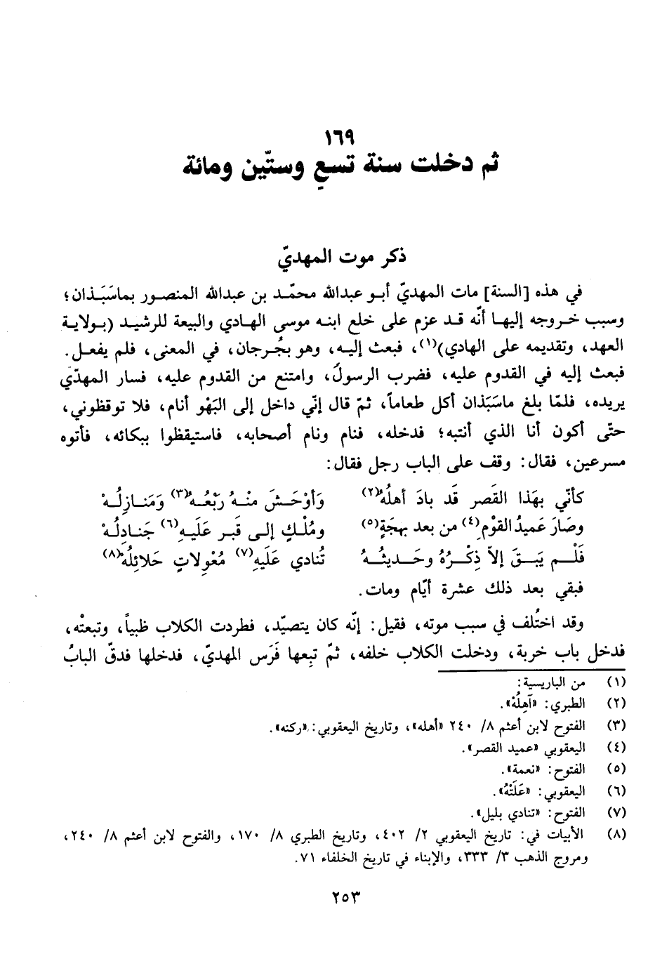 فِي هَذِهِ [السَّنَةِ] مَاتَ الْمَهْدِيُّ أَبُو عَبْدِ اللَّهِ مُحَمَّدُ بْنُ عَبْدِ اللَّهِ الْمَنْصُورِ بِمَاسَبَذَانَ، وَسَبَبُ خُرُوجِهِ إِلَيْهَا أَنَّهُ قَدْ عَزَمَ عَلَى خَلْعِ ابْنِهِ مُوسَى الْهَادِي وَالْبَيْعَةِ لِلرَّشِيدِ. (بِوِلَايَةِ الْعَهْدِ وَتَقْدِيمِهِ عَلَى الْهَادِي) ، فَبَعَثَ إِلَيْهِ، وَهُوَ بِجُرْجَانَ، فِي الْمَعْنَى، فَلَمْ يَفْعَلْ.
