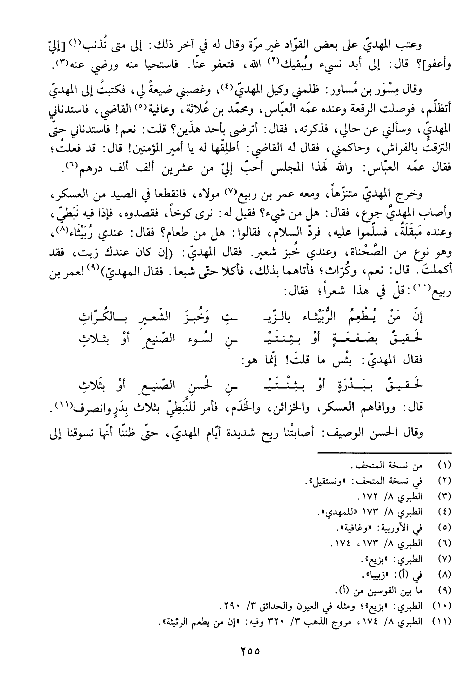 وَخَرَجَ الْمَهْدِيُّ مُتَنَزِّهًا، وَمَعَهُ عُمَرُ بْنُ رَبِيعٍ مَوْلَاهُ، فَانْقَطَعَا فِي الصَّيْدِ مِنَ الْعَسْكَرِ، وَأَصَابَ الْمَهْدِيَّ جُوعٌ، فَقَالَ: هَلْ مِنْ شَيْءٍ؟ فَقِيلَ لَهُ: نَرَى كُوخًا، فَقَصَدُوهُ، فَإِذَا فِيهِ نَبَطِيٌّ، وَعِنْدَهُ مَبْقَلَةٌ، فَسَلَّمُوا عَلَيْهِ، فَرَدَّ السَّلَامَ، فَقَالُوا: هَلْ مِنْ طَعَامٍ؟ فَقَالَ: عِنْدِي رُبَيْثَاءُ، وَهُوَ نَوْعٌ مِنَ الصَّحْنَاةِ، وَعِنْدِي خُبْزُ شَعِيرٍ، فَقَالَ الْمَهْدِيُّ: (إِنْ كَانَ عِنْدَكَ زَيْتٌ، فَقَدْ أَكْمَلْتَ. قَالَ: نَعَمْ، وَكُرَّاثٌ، فَأَتَاهُمَا بِذَلِكَ، فَأَكَلَا حَتَّى شَبِعَا. فَقَالَ الْمَهْدِيُّ) لِعُمَرَ بْنِ رَبِيعٍ: قُلْ فِي هَذَا شِعْرًا، فَقَالَ: