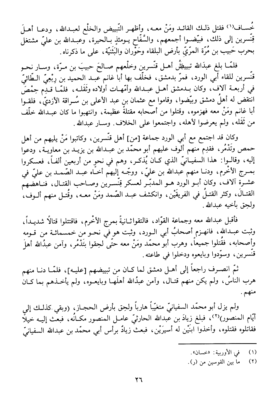 خُسَافٌ، فَقَتَلَ ذَلِكَ الْقَائِدَ وَمَنْ مَعَهُ، وَأَظْهَرَ التَّبْيِيضَ وَالْخَلْعَ لِعَبْدِ اللَّهِ، وَدَعَا أَهْلَ قِنَّسْرِينَ إِلَى ذَلِكَ، فَبَيَّضُوا أَجْمَعُهُمْ، وَالسَّفَّاحُ يَوْمَئِذٍ بِالْحِيرَةِ، وَعَبْدُ اللَّهِ بْنُ عَلِيٍّ مُشْتَغِلٌ بِحَرْبِ حَبِيبِ بْنِ مُرَّةَ الْمُرِّيِّ بِأَرْضِ الْبَلْقَاءِ وَحَوْرَانَ وَالْبَثَنِيَّةِ، عَلَى مَا ذَكَرْنَاهُ.