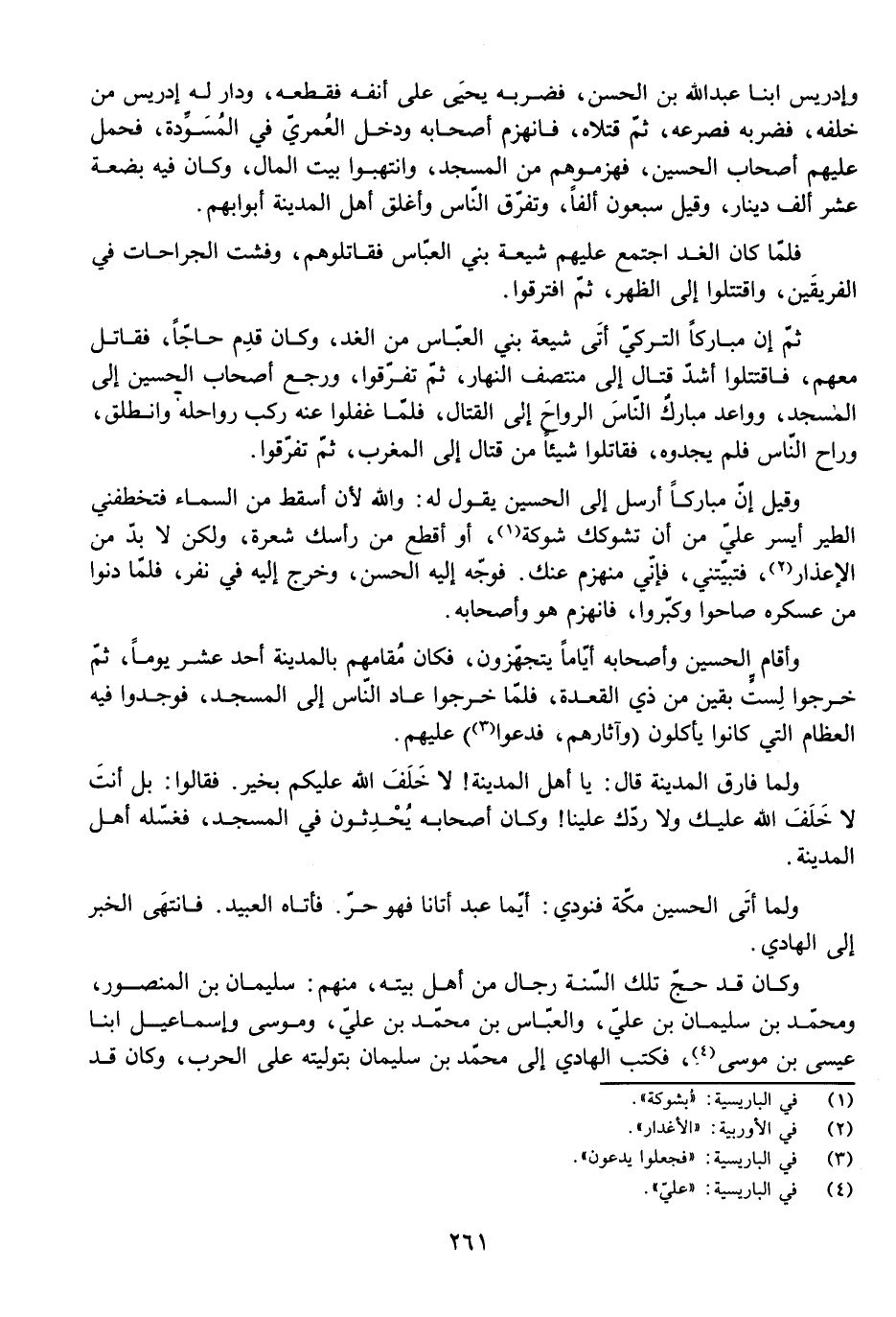 وَإِدْرِيسُ ابْنَا عَبْدِ اللَّهِ بْنِ الْحَسَنِ، فَضَرَبَهُ يَحْيَى عَلَى أَنْفِهِ فَقَطَعَهُ، وَدَارَ لَهُ إِدْرِيسُ مِنْ خَلْفِهِ، فَضَرَبَهُ فَصَرَعَهُ، ثُمَّ قَتَلَاهُ، فَانْهَزَمَ أَصْحَابُهُ، وَدَخَلَ الْعُمَرِيُّ فِي الْمُسَوِّدَةِ، فَحَمَلَ عَلَيْهِمْ أَصْحَابُ الْحُسَيْنِ، فَهَزَمُوهُمْ مِنَ الْمَسْجِدِ، وَانْتَهَبُوا بَيْتَ الْمَالِ، وَكَانَ فِيهِ بِضْعَةَ عَشَرَ أَلْفَ دِينَارٍ، وَقِيلَ سَبْعُونَ أَلْفًا، وَتَفَرَّقَ النَّاسُ وَأَغْلَقَ أَهْلُ الْمَدِينَةِ أَبْوَابَهُمْ.