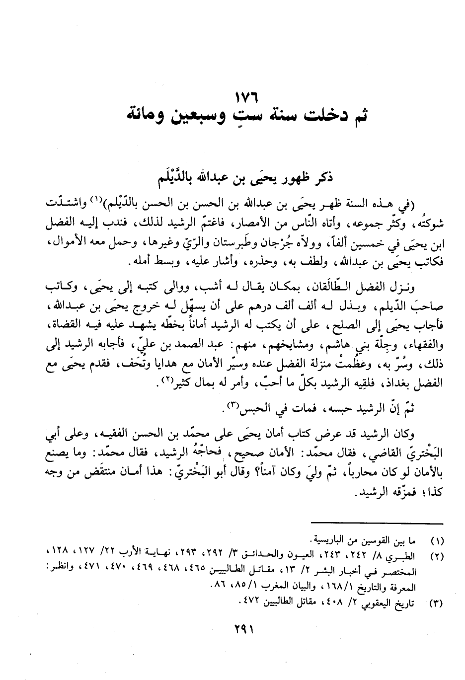 (فِي هَذِهِ السَّنَةِ ظَهَرَ يَحْيَى بْنُ عَبْدِ اللَّهِ بْنِ الْحَسَنِ بْنِ الْحَسَنِ بِالدَّيْلَمِ) وَاشْتَدَّتْ شَوْكَتُهُ، وَكَثُرَ جُمُوعُهُ، وَأَتَاهُ النَّاسُ مِنَ الْأَمْصَارِ، فَاغْتَمَّ الرَّشِيدُ لِذَلِكَ، فَنَدَبَ إِلَيْهِ الْفَضْلَ بْنَ يَحْيَى فِي خَمْسِينَ أَلْفًا، وَوَلَّاهُ جُرْجَانَ وَطَبَرِسْتَانَ وَالرَّيَّ وَغَيْرَهَا، وَحَمَلَ مَعَهُ الْأَمْوَالَ، فَكَاتَبَ يَحْيَى بْنَ عَبْدِ اللَّهِ، وَلَطُفَ بِهِ، وَحَذَّرَهُ، وَأَشَارَ عَلَيْهِ، وَبَسَطَ أَمَلَهُ.