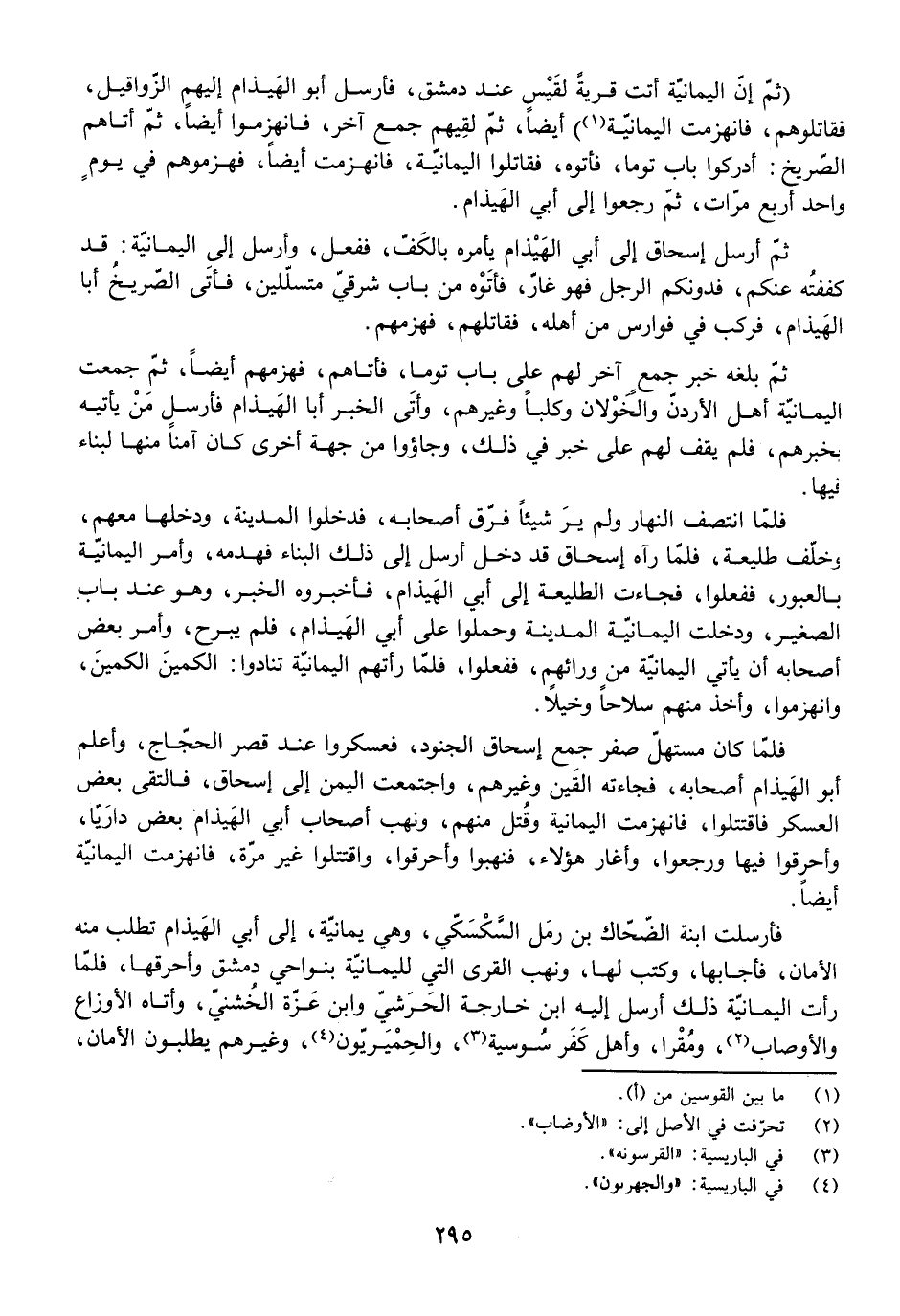 فَلَمَّا كَانَ مُسْتَهَلُّ صَفَرٍ جَمَعَ إِسْحَاقُ الْجُنُودَ، فَعَسْكَرُوا عِنْدَ قَصْرِ الْحَجَّاجِ، وَأَعْلَمَ أَبُو الْهَيْذَامِ أَصْحَابَهُ، فَجَاءَتْهُ الْقَيْنُ وَغَيْرُهُمْ، وَاجْتَمَعَتِ الْيَمَنُ إِلَى إِسْحَاقَ، فَالْتَقَى بَعْضُ الْعَسْكَرِ فَاقْتَتَلُوا، فَانْهَزَمَتِ الْيَمَانِيَّةُ وَقُتِلَ مِنْهُمْ وَنَهَبَ أَصْحَابُ أَبِي الْهَيْذَامِ بَعْضَ دَارِيَّا، وَأَحْرَقُوا فِيهَا وَرَجَعُوا، وَأَغَارَ هَؤُلَاءِ، فَنَهَبُوا وَأَحْرَقُوا، وَاقْتَتَلُوا غَيْرَ مَرَّةٍ، فَانْهَزَمَتِ الْيَمَانِيَّةُ أَيْضًا.