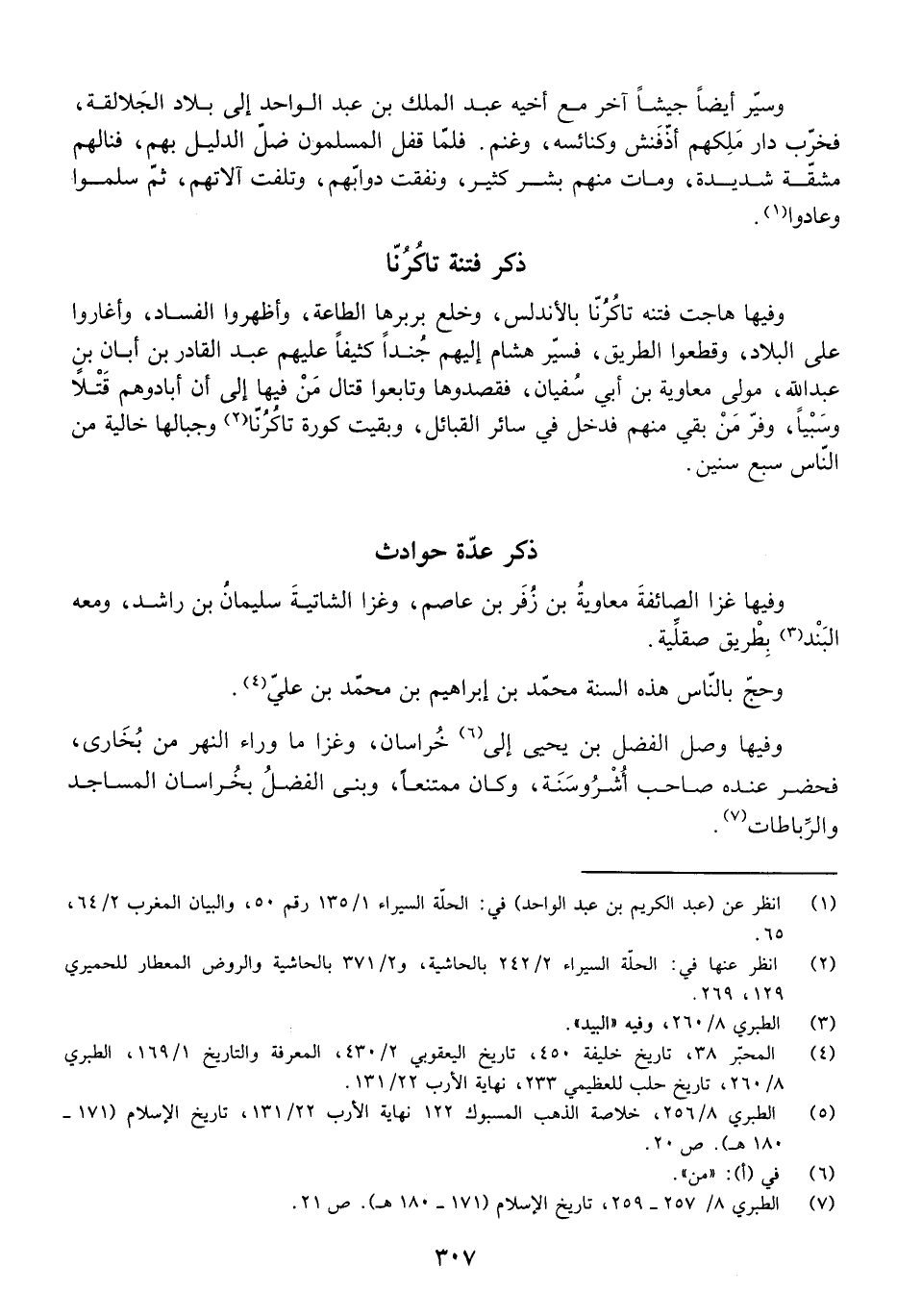 وَفِيهَا هَاجَتْ فِتْنَةُ تَاكُرُنَّا بِالْأَنْدَلُسِ، وَخَلَعَ بَرْبَرُهَا الطَّاعَةَ، وَأَظْهَرُوا الْفَسَادَ، وَأَغَارُوا عَلَى الْبِلَادِ، وَقَطَعُوا الطَّرِيقَ، فَسَيَّرَ هِشَامٌ إِلَيْهِمْ جُنْدًا كَثِيفًا عَلَيْهِمْ عَبْدُ الْقَادِرِ بْنُ أَبَانَ بْنِ عَبْدِ اللَّهِ، مَوْلَى مُعَاوِيَةَ بْنِ أَبِي سُفْيَانَ، فَقَصَدُوهَا وَتَابَعُوا قِتَالَ مَنْ فِيهَا إِلَى أَنْ أَبَادُوهُمْ قَتْلًا وَسَبْيًا، وَفَرَّ مَنْ بَقِيَ مِنْهُمْ فَدَخَلَ فِي سَائِرِ الْقَبَائِلِ، وَبَقِيَتْ كُورَةُ تَاكُرُنَّا وَجِبَالُهَا خَالِيَةً مِنَ النَّاسِ سَبْعَ سِنِينَ.