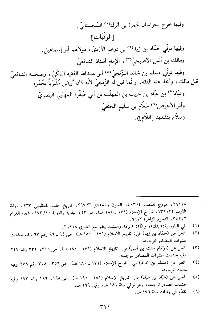 وَفِيهَا تُوُفِّيَ حَمَّادُ بْنُ زَيْدِ بْنِ دِرْهَمٍ الْأَزْدِيُّ، مَوْلَاهُمْ أَبُو إِسْمَاعِيلَ، وَمَالِكُ بْنُ أَنَسٍ الْأَصْبَحِيُّ، الْإِمَامُ أُسْتَاذُ الشَّافِعِيِّ.