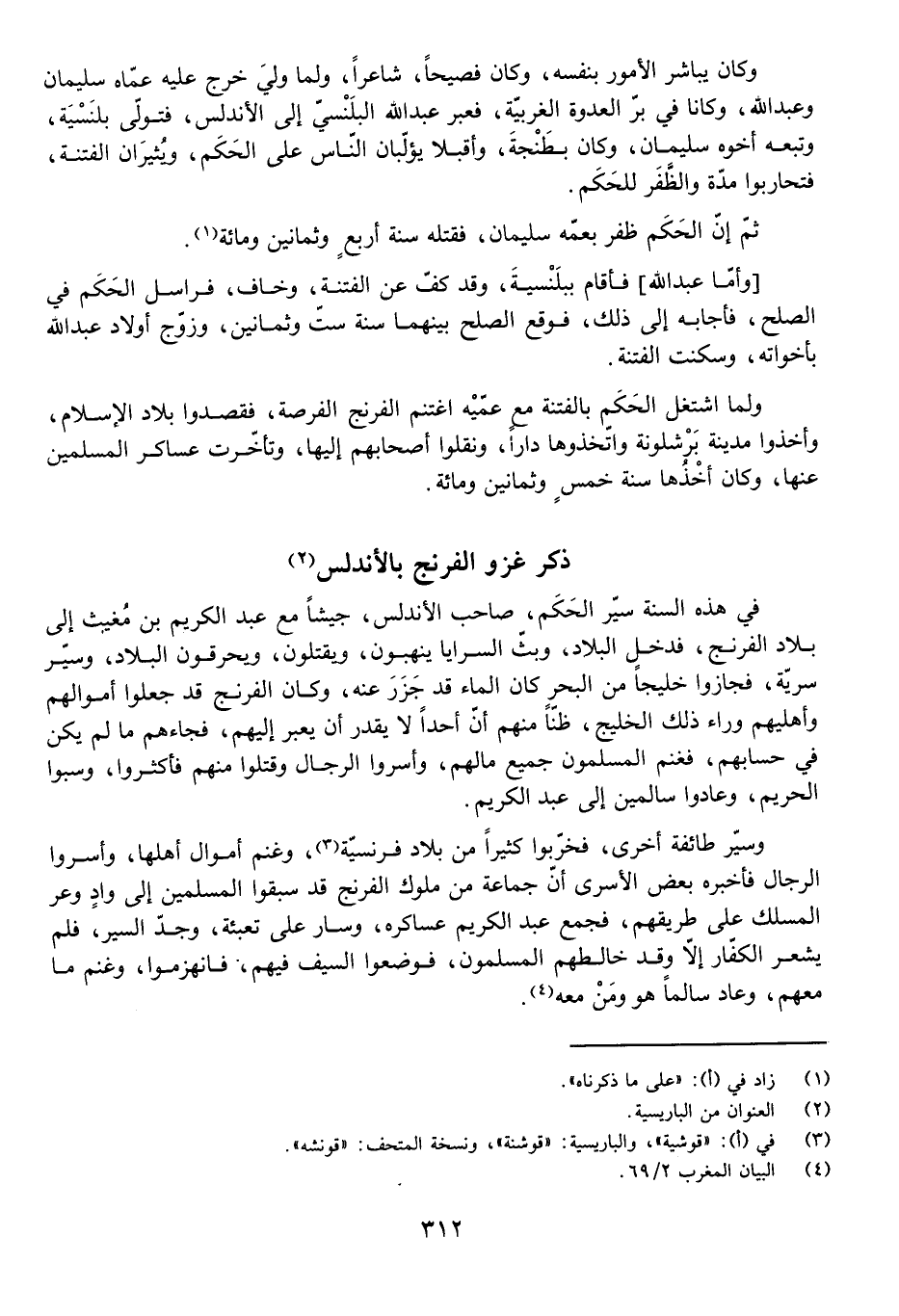 فِي هَذِهِ السَّنَةِ سَيَّرَ الْحَكَمُ صَاحِبُ الْأَنْدَلُسِ جَيْشًا مَعَ عَبْدِ الْكَرِيمِ بْنِ مُغِيثٍ إِلَى بِلَادِ الْفِرِنْجِ، فَدَخَلَ الْبِلَادَ، وَبَثَّ السَّرَايَا يَنْهَبُونَ، وَيُقَتِّلُونَ، وَيُحَرِّقُونَ الْبِلَادَ، وَسَيَّرَ سَرِيَّةً، فَجَازُوا خَلِيجًا مِنَ الْبَحْرِ كَانَ الْمَاءُ قَدْ جَزَرَ عَنْهُ، وَكَانَ الْفِرِنْجُ قَدْ جَعَلُوا أَمْوَالَهُمْ وَأَهْلِيهِمْ وَرَاءَ الْخَلِيجِ، ظَنًّا مِنْهُمْ أَنَّ أَحَدًا لَا يَقْدِرُ أَنْ يَعْبُرَ إِلَيْهِمْ، فَجَاءَهُمْ مَا لَمْ يَكُنْ فِي حِسَابِهِمْ، فَغَنِمَ الْمُسْلِمُونَ جَمِيعَ مَالِهِمْ، وَأَسَرُوا الرِّجَالَ وَقَتَلُوا مِنْهُمْ فَأَكْثَرُوا، وَسَبَوُا الْحَرِيمَ، وَعَادُوا سَالِمِينَ إِلَى عَبْدِ الْكَرِيمِ.