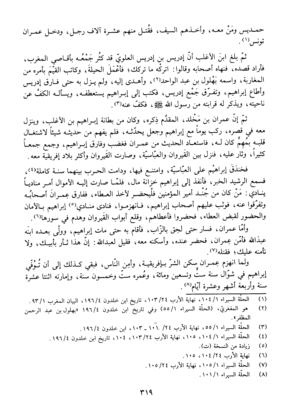 ثُمَّ بَلَغَ ابْنَ الْأَغْلَبِ أَنَّ إِدْرِيسَ بْنَ إِدْرِيسَ الْعَلَوِيَّ قَدْ كَثُرَ جَمْعُهُ بِأَقَاصِي الْمَغْرِبِ، فَأَرَادَ قَصْدَهُ، فَنَهَاهُ أَصْحَابُهُ وَقَالُوا: اتْرُكْهُ مَا تَرَكَكَ، فَأَعْمِلِ الْحِيلَةَ، وَكَاتِبِ الْقَيِّمَ بِأَمْرِهِ مِنَ الْمَغَارِبَةِ، وَاسْمُهُ بَهْلُولُ بْنُ عَبْدِ الْوَاحِدِ، وَأَهْدِ إِلَيْهِ، وَلَمْ يَزَلْ بِهِ حَتَّى فَارَقَ إِدْرِيسَ وَأَطَاعَ إِبْرَاهِيمَ، وَتَفَرَّقَ جَمْعُ إِدْرِيسَ، فَكَتَبَ إِلَى إِبْرَاهِيمَ يَسْتَعْطِفُهُ، وَيَسْأَلُهُ الْكَفَّ عَنْ نَاحِيَتِهِ، وَيَذْكُرُ لَهُ قَرَابَتَهُ مِنْ رَسُولِ اللَّهِ - صَلَّى اللَّهُ عَلَيْهِ وَسَلَّمَ - فَكَفَّ عَنْهُ.