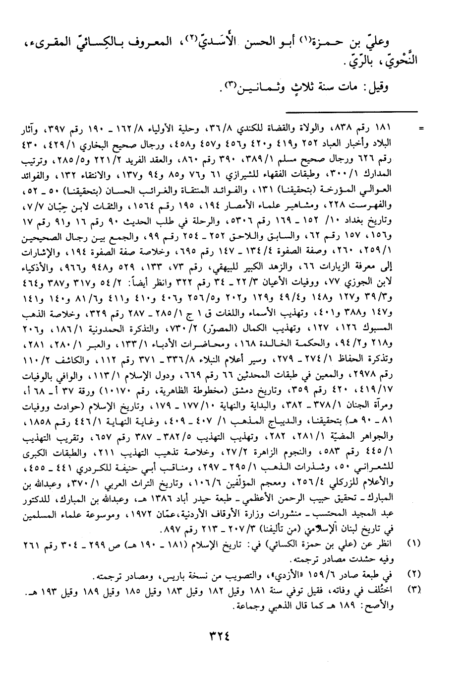 وَعَلِيُّ بْنُ حَمْزَةَ أَبُو الْحَسَنِ الْأَسَدِيُّ، الْمَعْرُوفُ بِالْكِسَائِيِّ، الْمُقْرِئُ، النَّحْوِيُّ، بِالرَّيِّ، وَقِيلَ: مَاتَ سَنَةَ ثَلَاثٍ وَثَمَانِينَ.