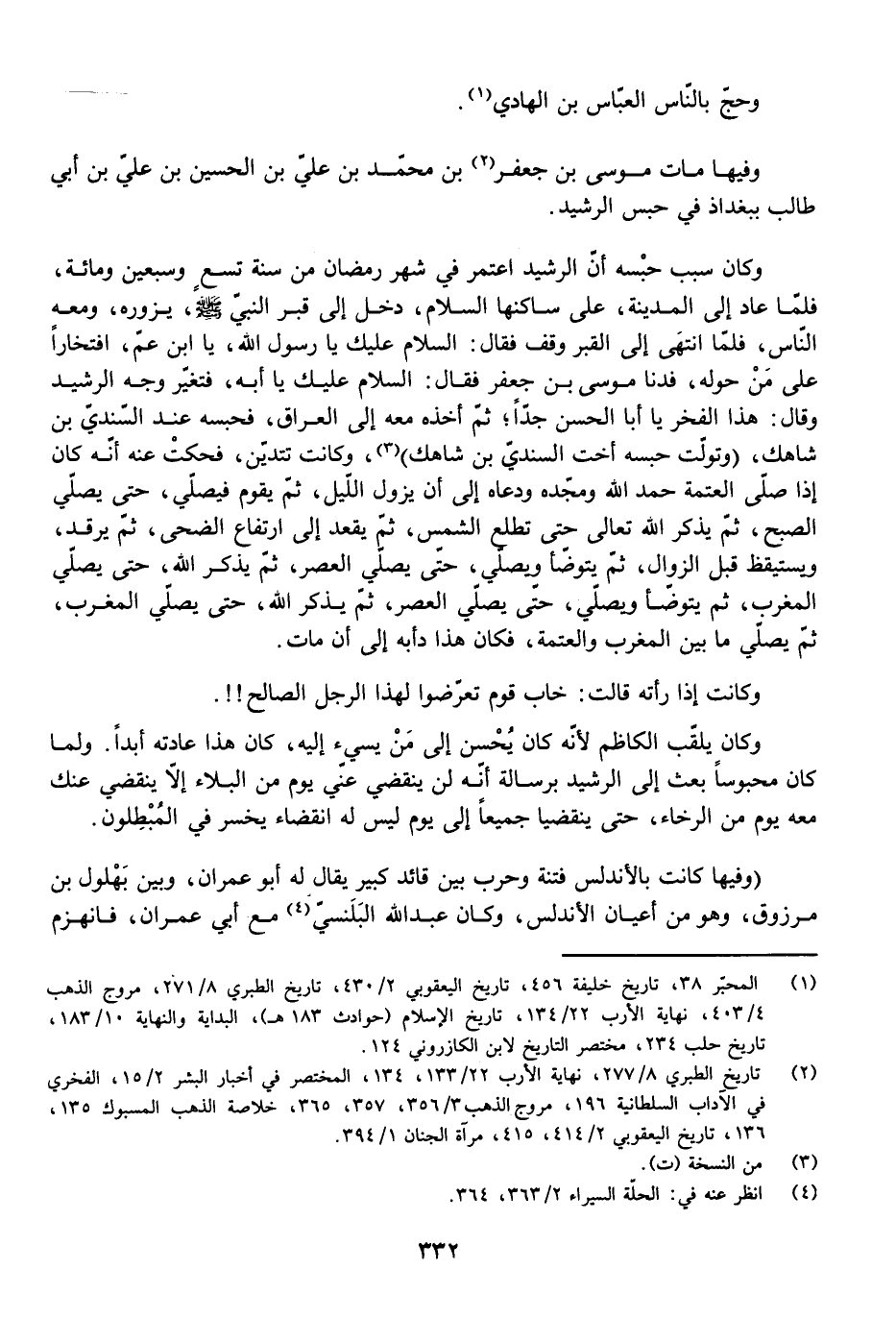 وَكَانَ سَبَبُ حَبْسِهِ أَنَّ الرَّشِيدَ اعْتَمَرَ فِي شَهْرِ رَمَضَانَ مِنْ سَنَةِ تِسْعٍ وَسَبْعِينَ وَمِائَةٍ، فَلَمَّا عَادَ إِلَى الْمَدِينَةِ - عَلَى سَاكِنِهَا السَّلَامُ - دَخَلَ إِلَى قَبْرِ النَّبِيِّ - صَلَّى اللَّهُ عَلَيْهِ وَسَلَّمَ - يَزُورُهُ، وَمَعَهُ النَّاسُ، فَلَمَّا انْتَهَى إِلَى الْقَبْرِ وَقَفَ فَقَالَ: السَّلَامُ عَلَيْكَ يَا رَسُولَ اللَّهِ، يَابْنَ عَمِّ، افْتِخَارًا عَلَى مَنْ حَوْلِهِ، فَدَنَا مُوسَى بْنُ جَعْفَرٍ فَقَالَ: السَّلَامُ عَلَيْكَ يَا أَبَهْ. فَتَغَيَّرَ وَجْهُ الرَّشِيدِ وَقَالَ: هَذَا الْفَخْرُ يَا أَبَا الْحَسَنِ جَدًّا. ثُمَّ أَخَذَهُ مَعَهُ إِلَى الْعِرَاقِ، فَحَبَسَهُ عِنْدَ السِّنْدِيِّ بْنِ شَاهَكَ، (وَتَوَلَّتْ حَبْسَهُ أُخْتُ السِّنْدِيِّ بْنِ شَاهَكَ) ، وَكَانَتْ تَتَدَيَّنُ، فَحَكَتْ عَنْهُ أَنَّهُ كَانَ إِذَا صَلَّى الْعَتَمَةَ حَمِدَ اللَّهَ وَمَجَّدَهُ وَدَعَاهُ إِلَى أَنْ يَزُولَ اللَّيْلُ، ثُمَّ يَقُومُ فَيُصَلِّي، حَتَّى يُصَلِّيَ الصُّبْحَ، ثُمَّ يَذْكُرُ اللَّهَ - تَعَالَى - حَتَّى تَطْلُعَ الشَّمْسُ، ثُمَّ يَقْعُدُ إِلَى ارْتِفَاعِ الضُّحَى، ثُمَّ يَرْقُدُ، وَيَسْتَيْقِظُ قَبْلَ الزَّوَالِ، ثُمَّ يَتَوَضَّأُ وَيُصَلِّي، حَتَّى يُصَلِّيَ الْعَصْرَ، ثُمَّ يَذْكُرُ اللَّهَ حَتَّى يُصَلِّيَ الْمَغْرِبَ، ثُمَّ يُصَلِّي مَا بَيْنَ الْمَغْرِبِ وَالْعَتَمَةِ، فَكَانَ هَذَا دَأْبَهُ إِلَى أَنْ مَاتَ.