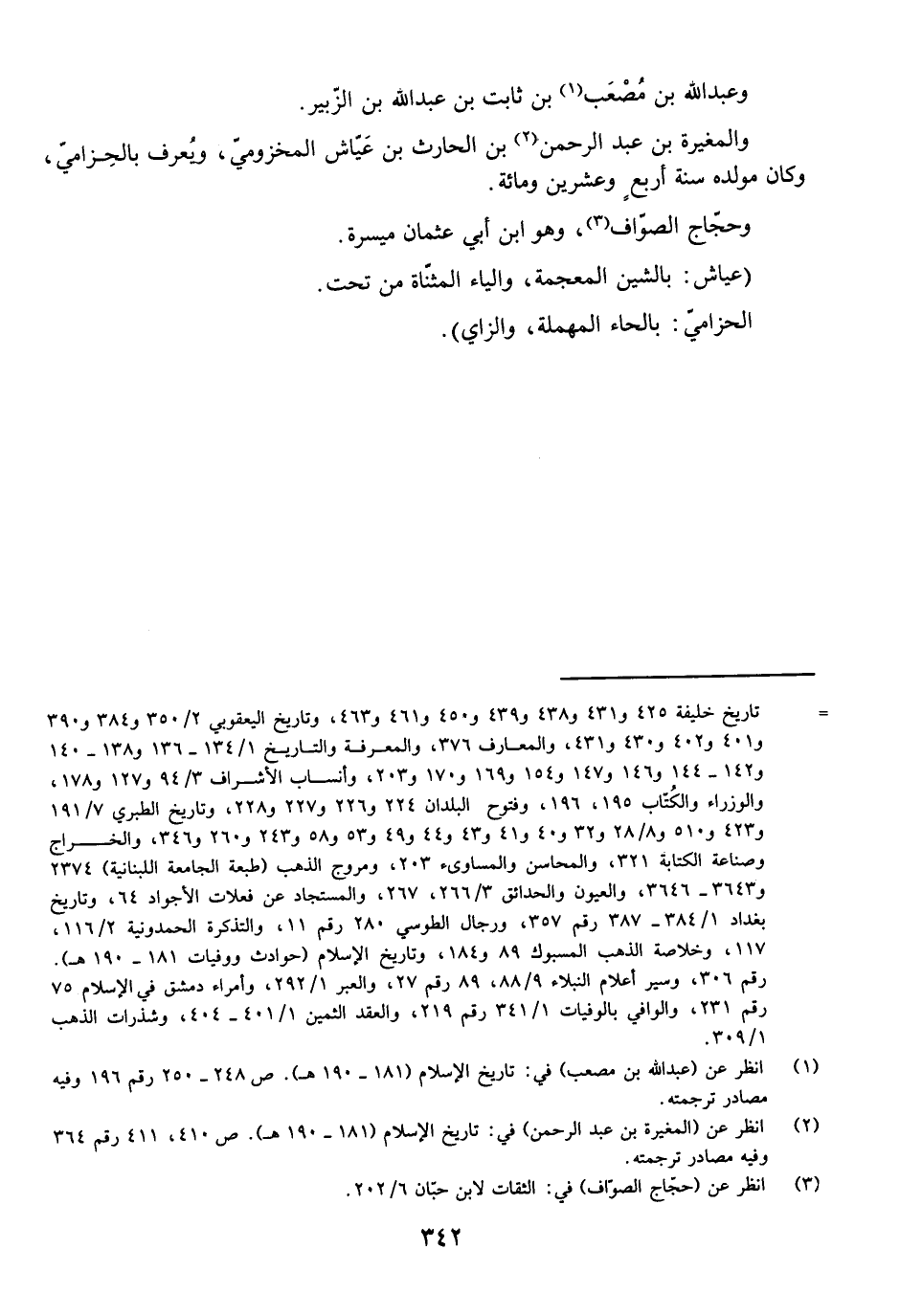 وَعَبْدُ اللَّهِ بْنُ مُصْعَبِ بْنِ ثَابِتِ بْنِ عَبْدِ اللَّهِ بْنِ الزُّبَيْرِ. وَالْمُغِيرَةُ بْنُ عَبْدِ الرَّحْمَنِ بْنِ الْحَارِثِ بْنِ عَيَّاشٍ الْمَخْزُومِيُّ، وَيَعْرَفُ بِالْحِزَامِيِّ، وَكَانَ مَوْلِدُهُ سَنَةَ أَرْبَعٍ وَعِشْرِينَ وَمِائَةٍ. وَحَجَّاجٌ الصَّوَّافُ، وَهُوَ ابْنُ أَبِي عُثْمَانَ مَيْسَرَةَ.