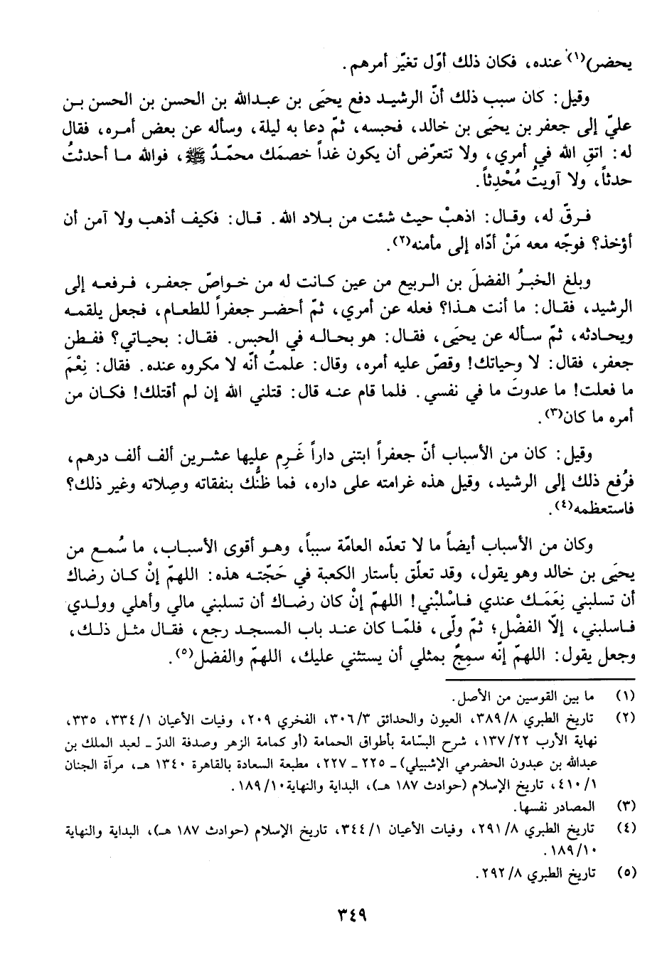 وَكَانَ مِنَ الْأَسْبَابِ أَيْضًا مَا لَا تَعُدُّهُ الْعَامَّةُ سَبَبًا، وَهُوَ أَقْوَى الْأَسْبَابِ، مَا سُمِعَ مِنْ يَحْيَى بْنِ خَالِدٍ وَهُوَ يَقُولُ وَقَدْ تَعَلَّقَ بِأَسْتَارِ الْكَعْبَةِ فِي حَجَّتِهِ هَذِهِ: اللَّهُمَّ إِنْ كَانَ رِضَاكَ أَنْ تَسْلُبَنِي نِعَمَكَ عِنْدِي فَاسْلُبْنِي! اللَّهُمَّ إِنْ كَانَ رِضَاكَ أَنْ تَسْلُبَنِي مَالِي وَأَهْلِي وَوَلَدِي فَاسْلُبْنِي، إِلَّا الْفَضْلَ. ثُمَّ وَلَّى، فَلَمَّا كَانَ عِنْدَ بَابِ الْمَسْجِدِ رَجَعَ، فَقَالَ مِثْلَ ذَلِكَ، وَجَعَلَ يَقُولُ: اللَّهُمَّ إِنَّهُ سَمِجٌ بِمِثْلِي أَنْ يَسْتَثْنِيَ عَلَيْكَ، اللَّهُمَّ وَالْفَضْلَ.