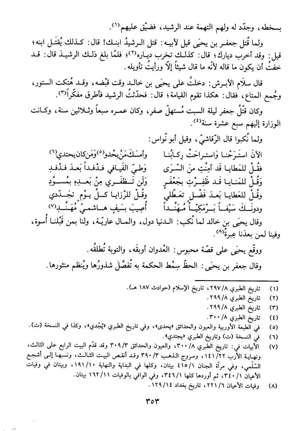 وَكَانَ قَتْلُ جَعْفَرٍ لَيْلَةَ السَّبْتِ مُسْتَهَلَّ صَفَرٍ، وَكَانَ عُمْرُهُ سَبْعًا وَثَلَاثِينَ سَنَةً، وَكَانَتِ الْوِزَارَةُ إِلَيْهِمْ سَبْعَ عَشْرَةَ سَنَةً، وَلَمَّا نُكِبُوا قَالَ الرَّقَاشِيُّ - وَقِيلَ: أَبُو نُوَاسٍ -: