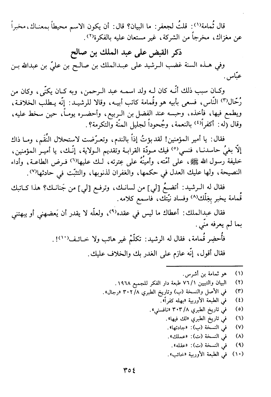 فَقَالَ لَهُ الرَّشِيدُ: أَتَضَعُ [لِي] مِنْ لِسَانِكَ، وَتَرْفَعُ [لِي] مِنْ جَنَانِكَ؟ هَذَا كَاتِبُكَ قُمَامَةُ يُخْبِرُ بِغِلِّكَ وَفَسَادِ نِيَّتِكَ، فَاسْمَعْ كَلَامَهُ.