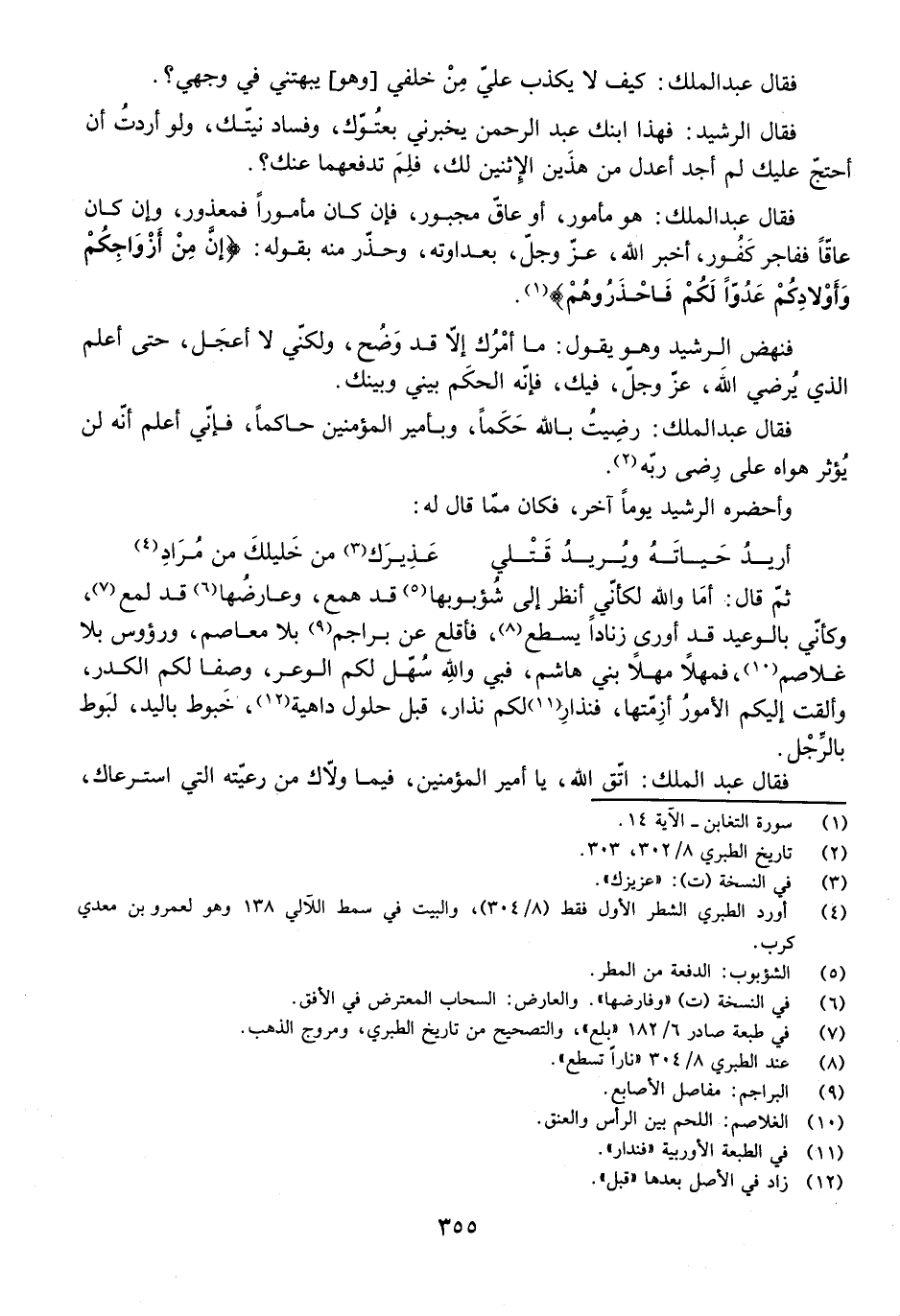 فَقَالَ عَبْدُ الْمَلِكِ: هُوَ مَأْمُورٌ، أَوْ عَاقٌّ مَجْبُورٌ، فَإِنْ كَانَ مَأْمُورًا فَمَعْذُورٌ، وَإِنْ كَانَ عَاقًّا فَفَاجِرٌ كَفُورٌ، أَخْبَرَ اللَّهُ - عَزَّ وَجَلَّ - بِعَدَاوَتِهِ، وَحَذَّرَ مِنْهُ بِقَوْلِهِ: {إِنَّ مِنْ أَزْوَاجِكُمْ وَأَوْلَادِكُمْ عَدُوًّا لَكُمْ فَاحْذَرُوهُمْ} [التغابن: 14] فَنَهَضَ الرَّشِيدُ وَهُوَ يَقُولُ: مَا أَمْرُكَ إِلَّا قَدْ وَضَحَ، وَلَكِنِّي لَا أَعْجَلُ، حَتَّى أَعْلَمَ الَّذِي يُرْضِي اللَّهَ - عَزَّ وَجَلَّ - فِيكَ، فَإِنَّهُ الْحَكَمُ بَيْنِي وَبَيْنَكَ.