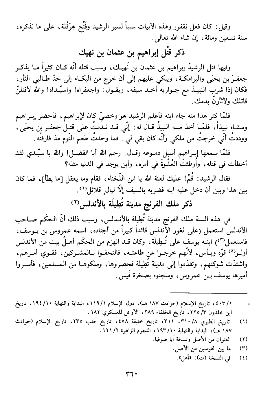 وَفِيهَا قَتَلَ الرَّشِيدُ إِبْرَاهِيمَ بْنَ عُثْمَانَ بْنَ نَهِيكٍ، وَسَبَبُ قَتْلِهِ أَنَّهُ كَانَ كَثِيرًا مَا يَذْكُرُ جَعْفَرَ بْنَ يَحْيَى وَالْبَرَامِكَةَ، وَيَبْكِي عَلَيْهِمْ إِلَى أَنْ خَرَجَ مِنَ الْبُكَاءِ إِلَى حَدِّ طَالِبِي الثَّأْرِ، فَكَانَ إِذَا شَرِبَ النَّبِيذَ مَعَ جَوَارِيهِ أَخَذَ سَيْفَهُ، وَيَقُولُ: وَاجَعْفَرَاهُ! وَاسَيِّدَاهُ! وَاللَّهِ لَأَقْتُلَنَّ قَاتِلَكَ وَلَأَثْأَرَنَّ بِدَمِكَ.