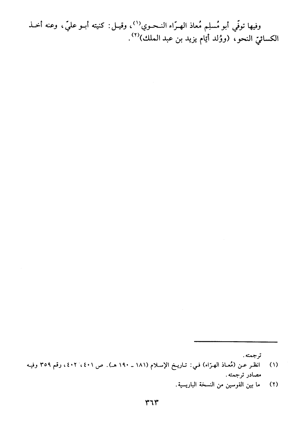 وَفِيهَا تُوُفِّيَ أَبُو مُسْلِمٍ مُعَاذُ الْهَرَّاءُ النَّحْوِيُّ، وَقِيلَ: كُنْيَتُهُ أَبُو عَلِيٍّ. وَعَنْهُ أَخَذَ الْكِسَائِيُّ النَّحْوَ، (وَوُلِدَ أَيَّامَ يَزِيدَ بْنِ عَبْدِ الْمَلِكِ) .
