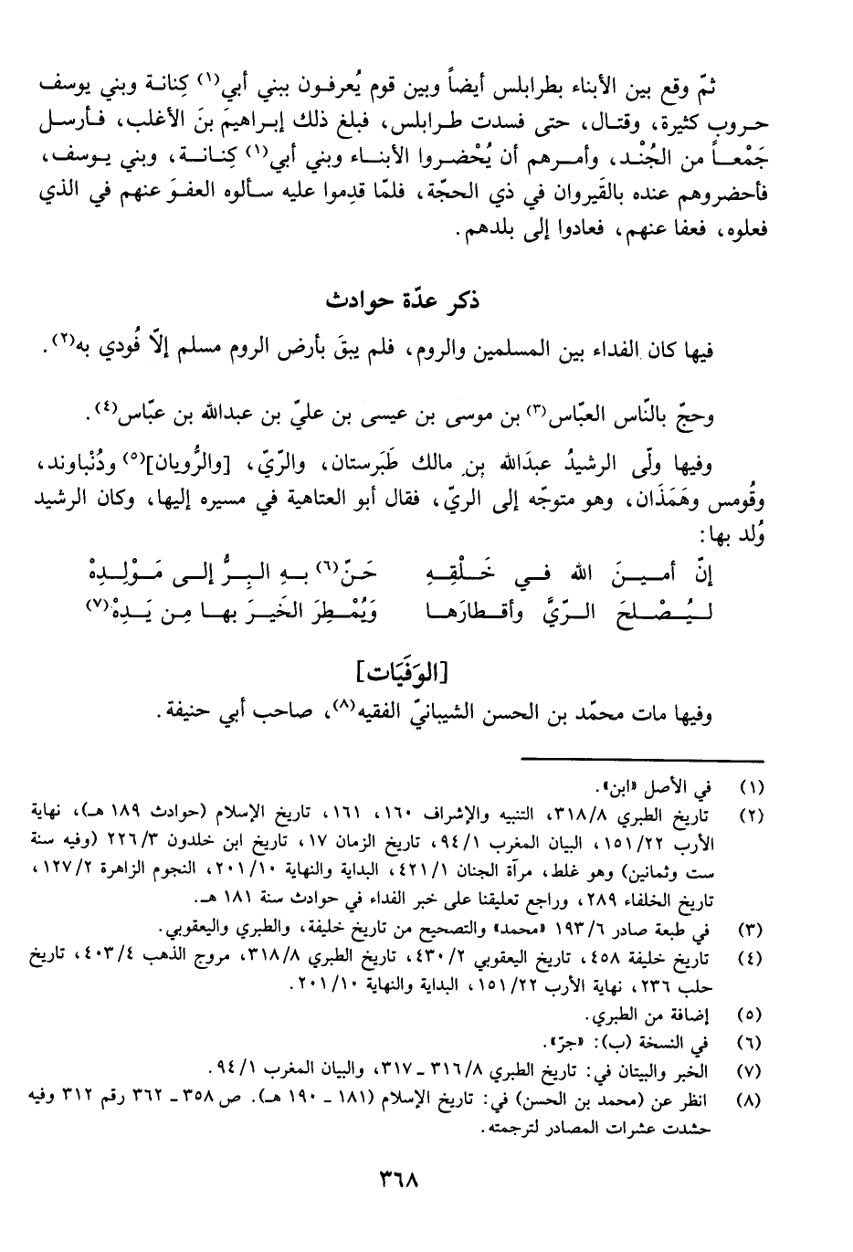 وَفِيهَا وَلَّى الرَّشِيدُ عَبْدَ اللَّهِ بْنَ مَالِكٍ طَبَرِسْتَانَ، وَالرَّيَّ، [وَالرُّويَانَ] ، وَدُنْبَاوَنْدَ، وَقُومِسَ وَهَمَذَانَ، وَهُوَ مُتَوَجِّهٌ إِلَى الرَّيِّ، فَقَالَ أَبُو الْعَتَاهِيَةِ فِي مَسِيرِهِ إِلَيْهَا، وَكَانَ الرَّشِيدُ وُلِدَ بِهَا: إِنَّ أَمِينَ اللَّهِ فِي خَلْقِهِ حَنَّ بِهِ الْبِرُّ إِلَى مَوْلِدِهْ لِيُصْلِحَ الرَّيَّ وَأَقْطَارَهَا وَيُمْطِرَ الْخَيْرَ بِهَا مِنْ يَدِهْ