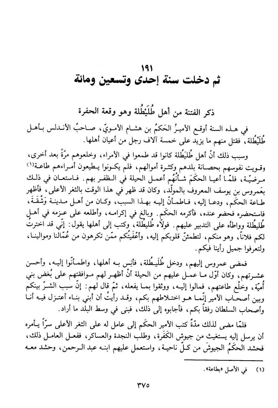 وَسَبَبُ ذَلِكَ أَنَّ أَهْلَ طُلَيْطِلَةَ كَانُوا قَدْ طَمِعُوا فِي الْأُمَرَاءِ، وَخَلَعُوهُمْ مَرَّةً بَعْدَ أُخْرَى، وَقَوِيَتْ نُفُوسُهُمْ بِحَصَانَةِ بَلَدِهِمْ وَكَثْرَةِ أَمْوَالِهِمْ، فَلَمْ يَكُونُوا يُطِيعُونَ أُمَرَاءَهُمْ طَاعَةً مُرْضِيَةً، فَلَمَّا أَعْيَا الْحَكَمَ شَأْنُهُمْ أَعْمَلَ الْحِيلَةَ فِي الظَّفَرِ بِهِمْ، فَاسْتَعَانَ فِي ذَلِكَ بِعَمْرُوسَ بْنِ يُوسُفَ الْمَعْرُوفِ بِالْمُوَلِّدِ، وَكَانَ قَدْ ظَهَرَ فِي هَذَا الْوَقْتِ بِالثَّغْرِ الْأَعْلَى، فَأَظْهَرَ طَاعَةَ الْحَكَمِ، وَدَعَا إِلَيْهِ، فَاطْمَأَنَّ إِلَيْهِ بِهَذَا السَّبَبِ، وَكَانَ مِنْ أَهْلِ مَدِينَةِ وَشْقَةَ، فَاسْتَحْضَرَهُ فَحَضَرَ عِنْدَهُ، فَأَكْرَمَهُ الْحَكَمُ، وَبَالَغَ فِي إِكْرَامِهِ، وَأَطْلَعَهُ عَلَى عَزْمِهِ فِي أَهْلِ طُلَيْطِلَةَ، وَوَاطَأَهُ عَلَى التَّدْبِيرِ عَلَيْهِمْ، فَوَلَّاهُ طُلَيْطِلَةَ، وَكَتَبَ إِلَى أَهْلِهَا يَقُولُ: إِنِّي قَدِ اخْتَرْتُ لَكُمْ فُلَانًا، وَهُوَ مِنْكُمْ، لِتَطْمَئِنَّ قُلُوبُكُمْ إِلَيْهِ، وَأَعْفَيْتُكُمْ مِمَّنْ تَكْرَهُونَ مِنْ عُمَّالِنَا وَمَوَالِينَا، وَلِتَعْرِفُوا جَمِيلَ رَأَيْنَا فِيكُمْ.