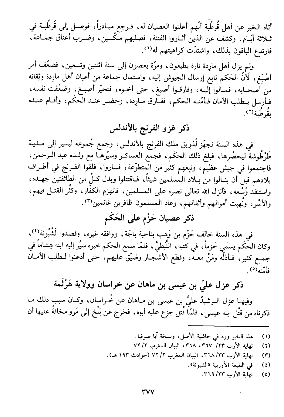 فِي هَذِهِ السَّنَةِ خَالَفَ حَزْمُ بْنُ وَهْبٍ بِنَاحِيَةِ بَاجَةَ، وَوَافَقَهُ غَيْرُهُ، وَقَصَدُوا لَشْبُونَةَ، وَكَانَ الْحَكَمُ يُسَمِّي حَزْمًا فِي كُتُبِهِ - النَّبَطِيَّ، فَلَمَّا سَمِعَ الْحَكَمُ خَبَرَهُ سَيَّرَ إِلَيْهِ ابْنَهُ هِشَامًا فِي جَمْعٍ كَثِيرٍ، فَأَذَلَّهُ وَمَنْ مَعَهُ، وَقَطَعَ الْأَشْجَارَ وَضَيَّقَ عَلَيْهِمْ، حَتَّى أَذْعَنُوا لِطَلَبِ الْأَمَانِ، فَأَمَّنَهُ.