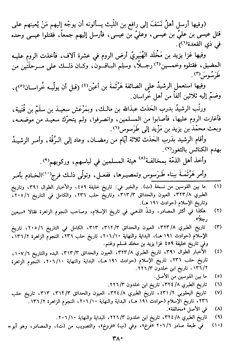 (وَفِيهَا أَرْسَلَ أَهْلُ نَسَفَ إِلَى رَافِعِ بْنِ اللَّيْثِ يَسْأَلُونَهُ أَنْ يُوَجِّهَ إِلَيْهِمْ مَنْ يُعِينُهُمْ عَلَى قَتْلِ عِيسَى بْنِ عَلِيِّ بْنِ عِيسَى، وَعَلِيِّ بْنِ عِيسَى، فَأَرْسَلَ إِلَيْهِمْ جَمْعًا، فَقَتَلُوا عِيسَى وَحْدَهُ فِي ذِي الْقَعْدَةِ) .