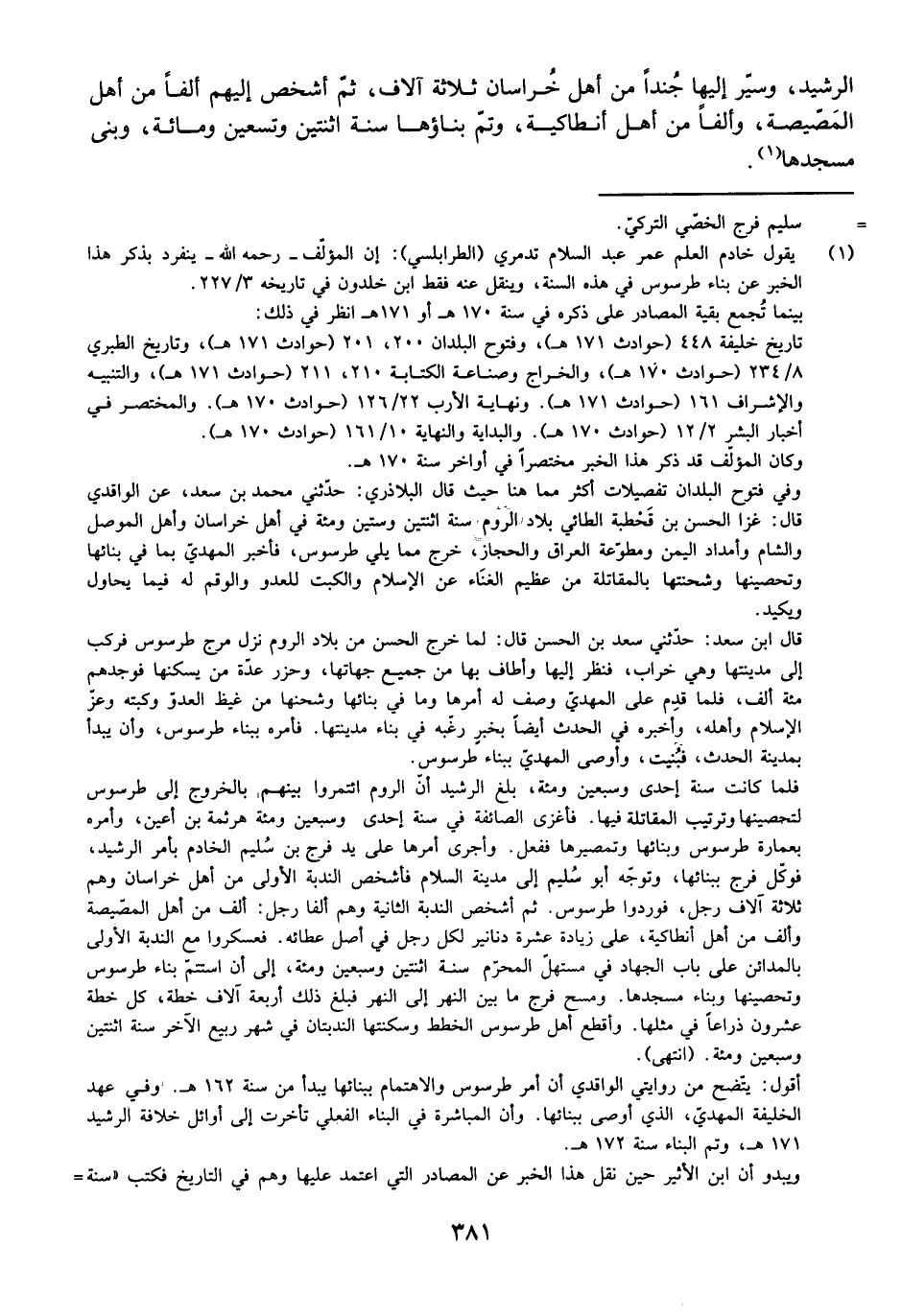 الرَّشِيدِ، وَسَيَّرَ إِلَيْهَا جُنْدًا مِنْ أَهْلِ خُرَاسَانَ ثَلَاثَةَ آلَافٍ، ثُمَّ أَشْخَصَ إِلَيْهِمْ أَلْفًا مِنْ أَهْلِ الْمَصِّيصَةِ، وَأَلْفًا مِنْ أَهْلِ أَنْطَاكِيَةَ، وَتَمَّ بِنَاؤُهَا سَنَةَ اثْنَتَيْنِ وَتِسْعِينَ وَمِائَةٍ، وَبَنَى مَسْجِدَهَا.