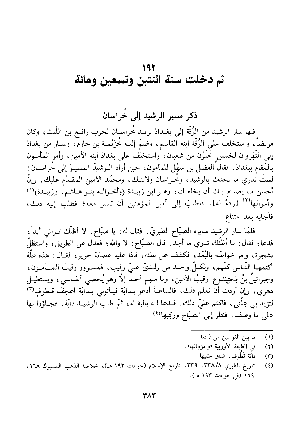فَلَمَّا سَارَ الرَّشِيدُ سَايَرَهُ الصَّبَّاحُ الطَّبَرِيُّ، فَقَالَ لَهُ: يَا صَبَّاحُ، لَا أَظُنُّكَ تَرَانِي أَبَدًا. فَدَعَا، فَقَالَ: مَا أَظُنُّكَ تَدْرِي مَا أَجِدُ. قَالَ الصَّبَّاحُ: لَا وَاللَّهِ. فَعَدَلَ عَنِ الطَّرِيقِ، وَاسْتَظَلَّ بِشَجَرَةٍ، وَأَمَرَ خَوَاصَّهُ بِالْبُعْدِ، فَكَشَفَ عَنْ بَطْنِهِ، فَإِذَا عَلَيْهِ عِصَابَةٌ حَرِيرٌ، فَقَالَ: هَذِهِ عِلَّةٌ أَكْتُمُهَا النَّاسَ كُلَّهُمْ، وَلِكُلِّ وَاحِدٍ مِنْ وَلَدَيَّ عَلَيَّ رَقِيبٌ، فَمَسْرُورٌ رَقِيبُ الْمَأْمُونِ، وَجِبْرَائِيلُ بْنُ بَخْتِيَشُوعَ رَقِيبُ الْأَمِينِ، وَمَا مِنْهُمْ أَحَدٌ إِلَّا وَهُوَ يُحْصِي أَنْفَاسِي، وَيَسْتَطِيلُ دَهْرِي، وَإِنْ أَرَدْتَ أَنْ تَعْلَمَ ذَلِكَ، فَالسَّاعَةَ أَدْعُو بِدَابَّةٍ، فَيَأْتُونِي بِدَابَّةٍ أَعْجَفَ قَطُوفٍ لِتَزِيدَ بِي عِلَّتِي، فَاكْتُمْ عَلَيَّ ذَلِكَ. فَدَعَا لَهُ بِالْبَقَاءِ، ثُمَّ طَلَبَ الرَّشِيدُ دَابَّةً، فَجَاءُوا بِهَا عَلَى مَا وَصَفَ، فَنَظَرَ إِلَى الصَّبَّاحِ وَرَكِبَهَا.