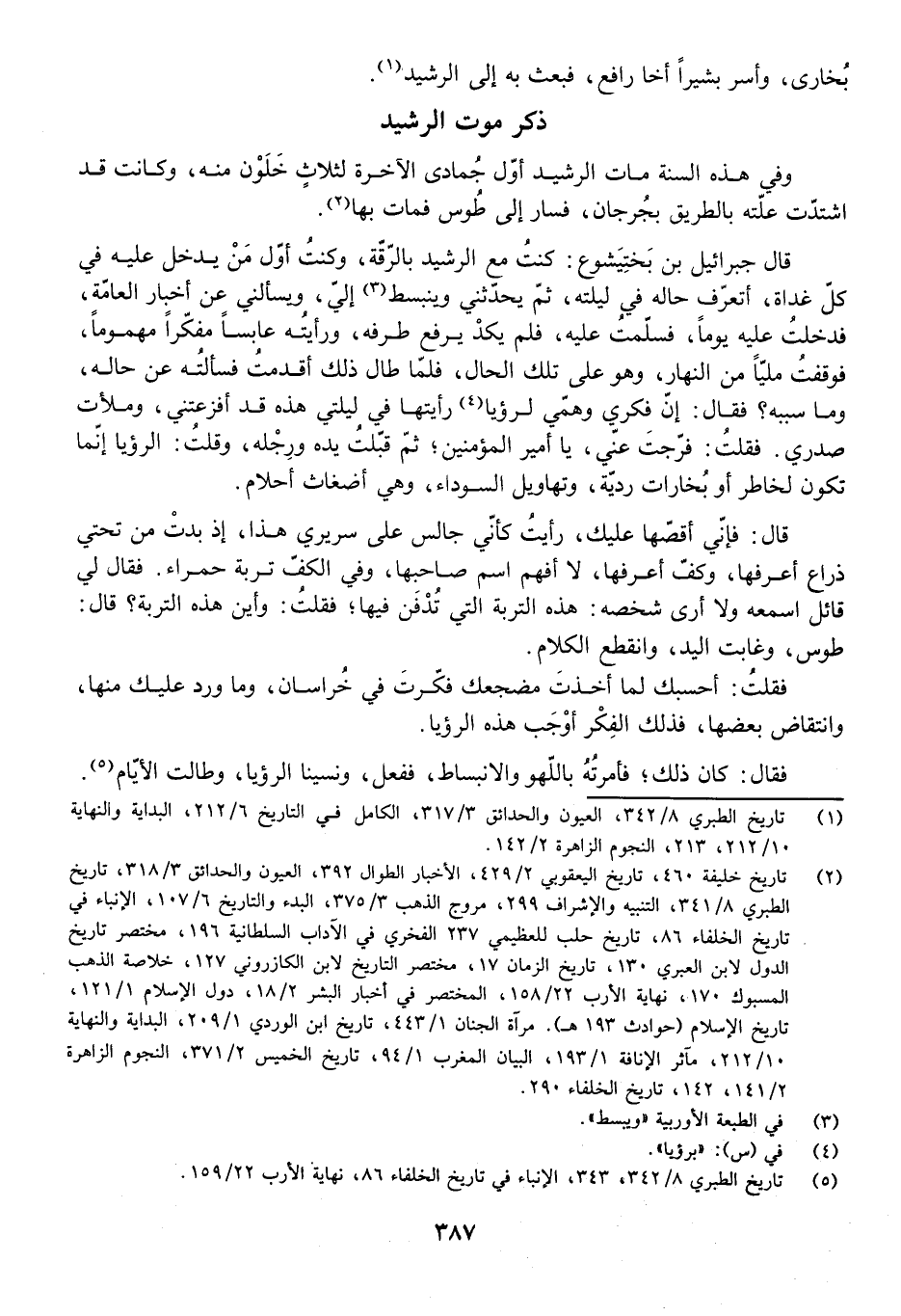 قَالَ جِبْرَائِيلُ بْنُ بَخْتِيَشُوعَ: كُنْتُ مَعَ الرَّشِيدِ بِالرَّقَّةِ، وَكُنْتُ أَوَّلَ مَنْ يَدْخُلُ عَلَيْهِ فِي كُلِّ غَدَاةٍ، أَتَعَرَّفُ حَالَهُ فِي لَيْلَتِهِ، ثُمَّ يُحَدِّثُنِي وَيَنْبَسِطُ إِلَيَّ، وَيَسْأَلُنِي عَنْ أَخْبَارِ الْعَامَّةِ، فَدَخَلْتُ عَلَيْهِ يَوْمًا، فَسَلَّمْتُ عَلَيْهِ، فَلَمْ يَكَدْ يَرْفَعُ طَرْفَهُ، وَرَأَيْتُهُ عَابِسًا مُفَكِّرًا مَهْمُومًا، فَوَقَفْتُ مَلِيًّا مِنَ النَّهَارِ وَهُوَ عَلَى تِلْكَ الْحَالِ، فَلَمَّا طَالَ ذَلِكَ أَقْدَمْتُ فَسَأَلْتُهُ عَنْ حَالِهِ، وَمَا سَبَبُهُ، فَقَالَ: إِنَّ فِكْرِي وَهَمِّي لِرُؤْيَا رَأَيْتُهَا فِي لَيْلَتِي هَذِهِ قَدْ أَفْزَعَتْنِي، وَمَلَأَتْ صَدْرِي. فَقُلْتُ: فَرَّجْتَ عَنِّي يَا أَمِيرَ الْمُؤْمِنِينَ. ثُمَّ قَبَّلْتُ يَدَهُ وَرِجْلَهُ، وَقُلْتُ: الرُّؤْيَا إِنَّمَا تَكُونُ لِخَاطِرٍ أَوْ بُخَارَاتٍ رَدِيَّةٍ، وَتَهَاوِيلِ السَّوْدَاءِ، وَهِيَ أَضْغَاثُ أَحْلَامٍ.