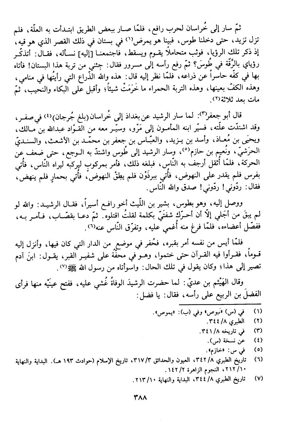 وَوَصَلَ إِلَيْهِ، وَهُوَ بِطُوسَ، بَشِيرُ بْنُ اللَّيْثِ أَخُو رَافِعٍ أَسِيرًا، فَقَالَ الرَّشِيدُ: وَاللَّهِ لَوْ لَمْ يَبْقَ مِنْ أَجَلِي إِلَّا أَنْ أُحَرِّكَ شَفَتَيَّ بِكَلِمَةٍ لَقُلْتُ: اقْتُلُوهُ. ثُمَّ دَعَا بِقَصَّابٍ، فَأَمَرَ بِهِ، فَفَصَلَ أَعْضَاءَهُ، فَلَمَّا فَرَغَ مِنْهُ أُغْمِيَ عَلَيْهِ، وَتَفَرَّقَ النَّاسُ عَنْهُ.