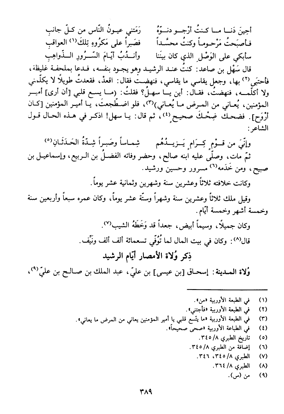 قَالَ سَهْلُ بْنُ صَاعِدٍ: كُنْتُ عِنْدَ الرَّشِيدِ وَهُوَ يَجُودُ بِنَفْسِهِ، فَدَعَا بِمِلْحَفَةٍ غَلِيظَةٍ، فَاحْتَبَى بِهَا، وَجَعَلَ يُقَاسِي مَا يُقَاسِي، فَنَهَضْتُ، فَقَالَ: اقْعُدْ. فَقَعَدْتُ طَوِيلًا لَا يُكَلِّمُنِي وَلَا أُكَلِّمُهُ، فَنَهَضْتُ، فَقَالَ: أَيْنَ يَا سَهْلُ؟ فَقُلْتُ: (مَا يَسَعُ قَلْبِي [أَنْ أَرَى] أَمِيرَ الْمُؤْمِنِينَ يُعَانِي مِنَ الْمَرَضِ مَا يُعَانِي) ، فَلَوِ اضْطَجَعْتَ يَا أَمِيرَ الْمُؤْمِنِينَ [كَانَ أَرْوَحَ] . فَضَحِكَ ضِحْكَ صَحِيحٍ، ثُمَّ قَالَ: يَا سَهْلُ، اذْكُرْ فِي هَذِهِ الْحَالِ قَوْلَ الشَّاعِرِ: