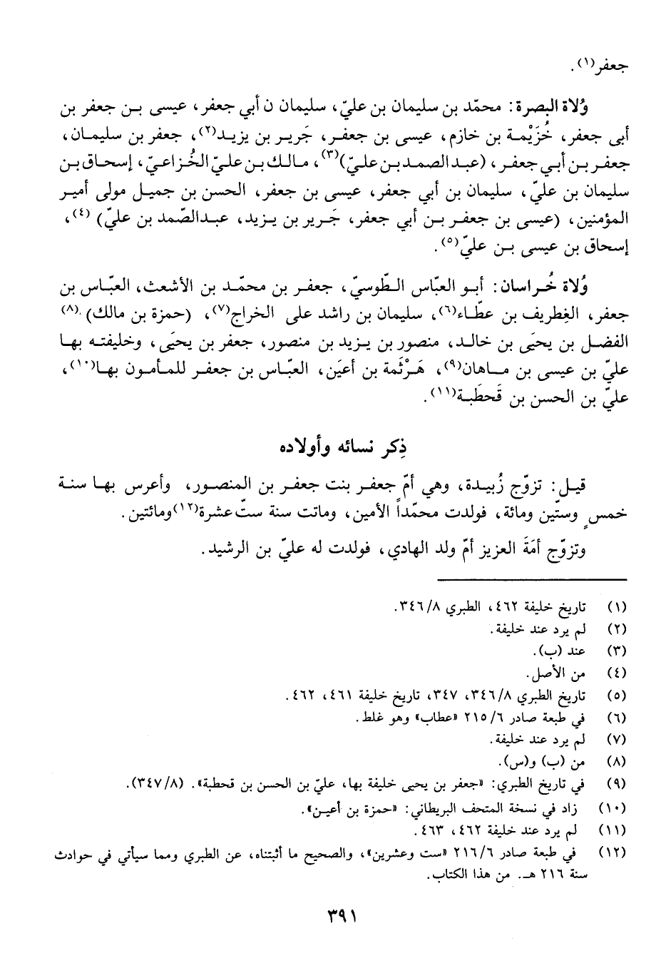 وُلَاةُ الْبَصْرَةِ: مُحَمَّدُ بْنُ سُلَيْمَانَ بْنِ عَلِيٍّ، سُلَيْمَانُ بْنُ أَبِي جَعْفَرٍ، عِيسَى بْنُ جَعْفَرِ بْنِ أَبِي جَعْفَرٍ، خُزَيْمَةُ بْنُ خَازِمٍ، عِيسَى بْنُ جَعْفَرٍ، جَرِيرُ بْنُ يَزِيدَ، جَعْفَرُ بْنُ سُلَيْمَانَ، جَعْفَرُ بْنُ أَبِي جَعْفَرٍ، (عَبْدُ الصَّمَدِ بْنُ عَلِيٍّ) ، مَالِكُ بْنُ عَلِيٍّ الْخُزَاعِيُّ، إِسْحَاقُ بْنُ سُلَيْمَانَ بْنِ عَلِيٍّ، سُلَيْمَانُ بْنُ أَبِي جَعْفَرٍ، عِيسَى بْنُ جَعْفَرٍ، الْحَسَنُ بْنُ جَمِيلٍ مَوْلَى أَمِيرِ الْمُؤْمِنِينَ، (عِيسَى بْنُ جَعْفَرِ بْنِ أَبِي جَعْفَرٍ، جَرِيرُ بْنُ يَزِيدَ، عَبْدُ الصَّمَدِ بْنُ عَلِيٍّ) ، إِسْحَاقُ بْنُ عِيسَى بْنِ عَلِيٍّ.