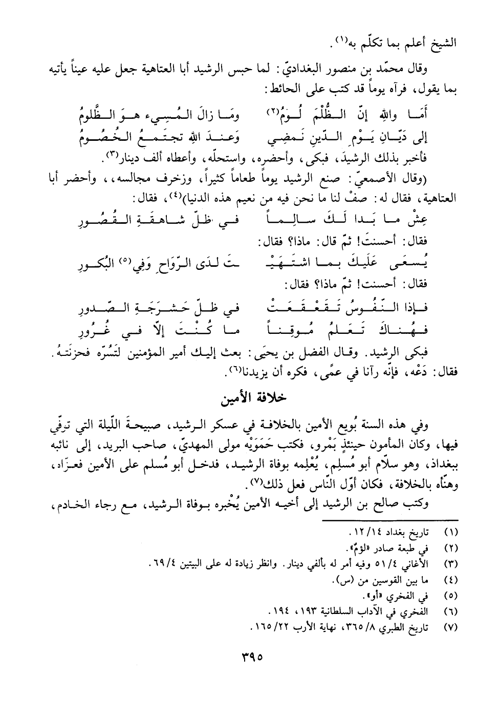 (وَقَالَ الْأَصْمَعِيُّ: صَنَعَ الرَّشِيدُ يَوْمًا طَعَامًا كَثِيرًا، وَزَخْرَفَ مَجَالِسَهُ، وَأَحْضَرَ أَبَا الْعَتَاهِيَةِ، فَقَالَ لَهُ: صِفْ لَنَا مَا نَحْنُ فِيهِ مِنْ نَعِيمِ هَذِهِ الدُّنْيَا) ، فَقَالَ: